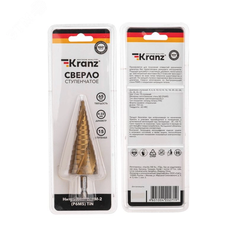 Ступенчатое сверло KRANZ предназначено для сверления отверстий различных диаметров. Применяется в работе с такими материалами, как - пластик, дерево, металл и др. На каждой ступени есть маркировка фактического диаметра. Шестигранный хвостовик Е6,3 позволяет фиксировать сверло во всех типах патронов шуруповертов и дрелей. Сверло изготовлено из быстрорежущей инструментальной стали. Обладает высокой прочностью и повышенной и точностью в отличие от обычных сверл данного типа.
