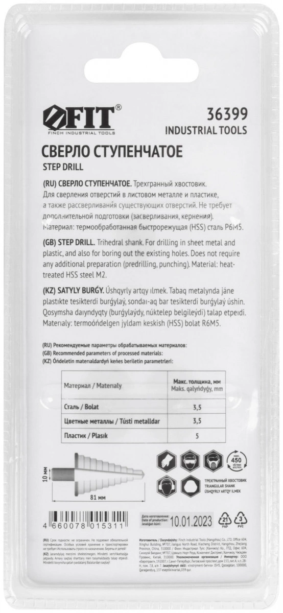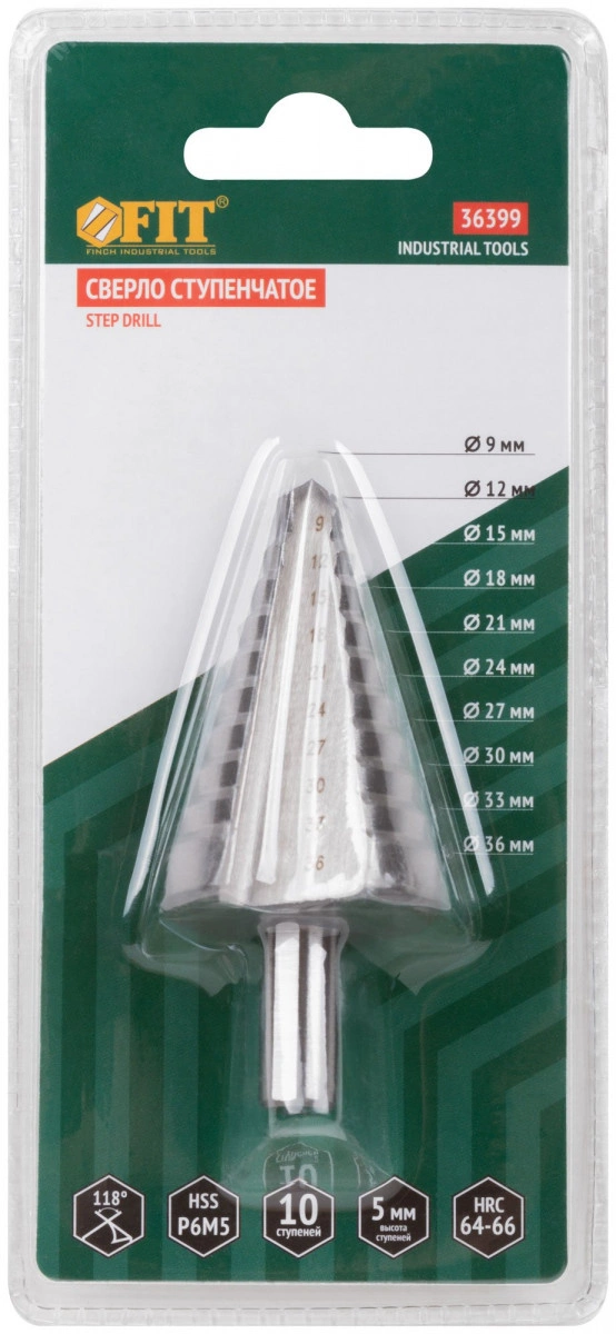 Ступенчатое сверло FIT IT предназначено для сверления и рассверливания отверстий в листовых материалах (сталь, цветные металлы, пластик). Сверло изготовлено из полированной быстрорежущей (HSS) стали Р6М5, что обеспечивает его долговечность и надежность в использовании. Сверла обладают высокой термостойкостью и износоустойчивостью, что гарантирует им увеличенный ресурс. Конструкция сверла обеспечивает улучшенный отвод отходов сверления.