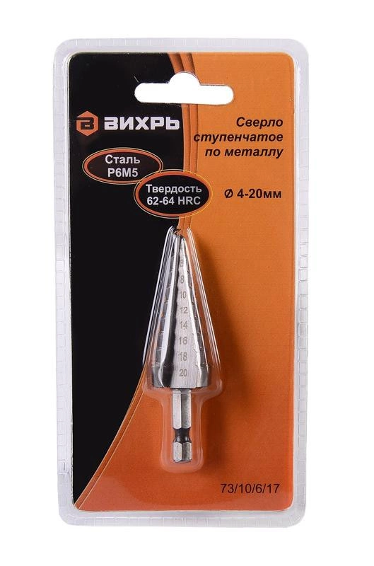 Полное описание: Сверло ступенчатое по металлу 4-6-8-10-12-14-16-18-20мм P6M5 шестигранный хвостовик Вихрь 73/10/6/17