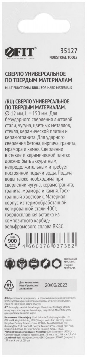 Для безударного сверления листовой стали, чугуна, цветных металлов, стекла, керамической плитки и керамогранита. Для ударного сверления бетона, кирпича, гранита, мрамора и камня. Сверление в стекле и керамической плитке должно быть аккуратным и непродолжительным. Подача воды необходима при сверлении стекла, мрамора, камня, чугуна, керамической плитки и керамогранита. Трехгранный хвостовик. Материал: корпус из легированной стали 40Cr, режущая вставка из карбида вольфрама ВК8С. Упаковка: блистер.