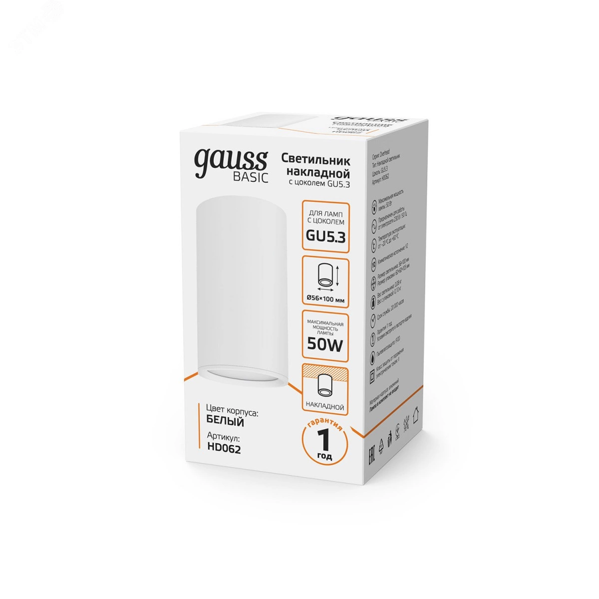 Светильник ДБО под лампу 1хGU5.3 AC 170-240В Белый IP20 100х56х100мм Алюминий Basic Gauss