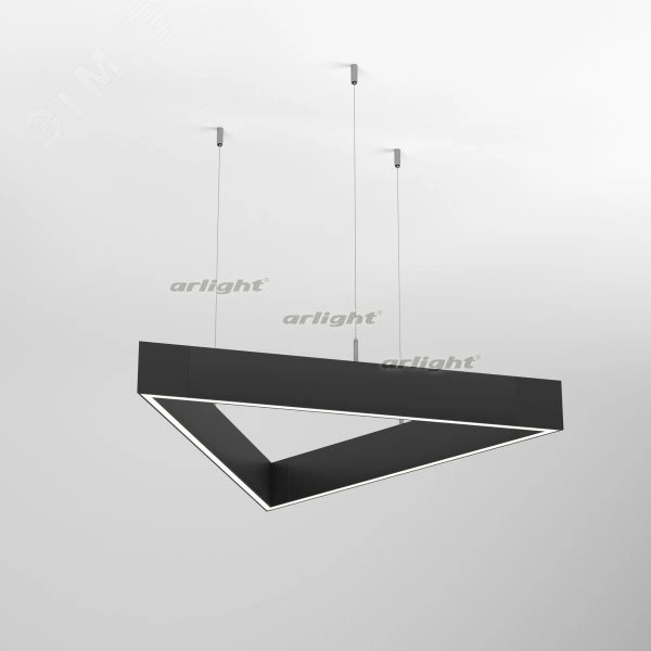 Подвесной треугольный светильник с возможностью диммирования и свечением вверх и вниз. Мощность 129 Вт, св. поток 11700 лм, 90 лм/Вт, дневной 4000 K, CRI-80, угол 100плюс 100 градусов , напряжение питания 230 В. Черный линейный корпус из алюминия, экран пластик, степень защиты IP20. Размер - длина 1376 мм, ширина 1191 мм, высота 94 мм, длина одной грани 1376 мм. Длина подвеса 1500 мм. Монтаж подвесной. Драйвер 33-40 В, 750 мА, пульсация <5%. Диммирование 0-10V. В комплекте набор для подвеса и кабель 1,5 м. Поставляется в разобранном виде.