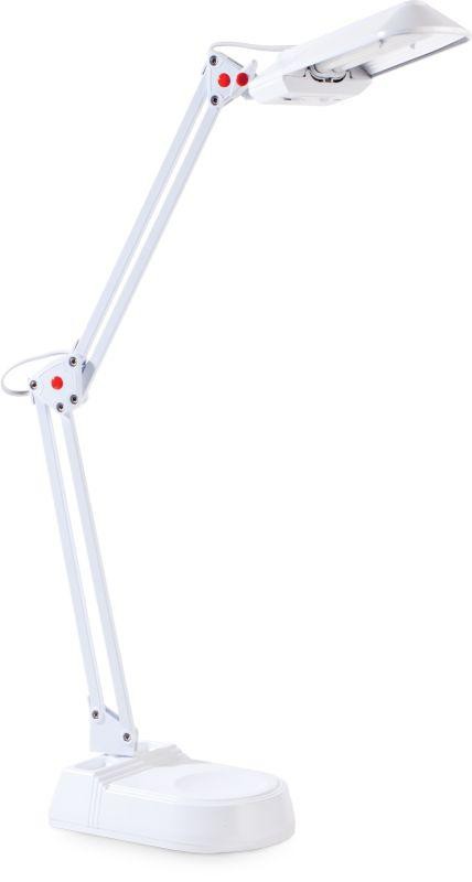 Светильник настольный KD-017A С01 белый служит для освещения рабочего места дома и в офисе. Стильный дизайн светильника украсит интерьер, оформленный в любом стиле. Плафон светильника изготовлен из пластика. Регулируется по углу наклона и повороту. Двухзвенная стойка, изготовленная из металла, позволяет менять высоту плафона в широком диапазоне. Два варианта установки светильника: струбцина и основание. Источник света- энергосберегающие люминесцентные лампы, которые потребляют всего 11 Вт и безопасны для глаз. Выключатель – нажимной на верхней части плафона. Длина провода 1,6 метра. Стиль офисный.