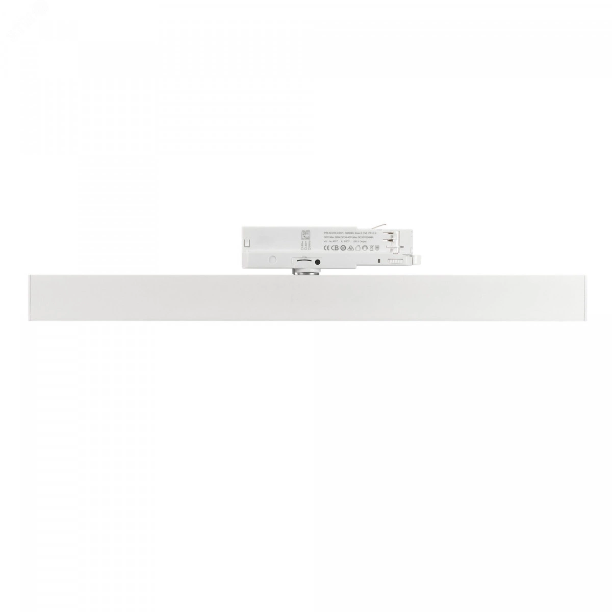 Светильник подвесной для треков/шин 4 провода. Мощность 25 Вт, св. поток 2078 лм, 83 лм/Вт, теплый 3000 K, CRI-90, угол 100 градусов , напряжение питания 230 В. Белый корпус из алюминия, материал рассеивателя PC, степень защиты IP20. Размер - длина 605 мм, ширина 34 мм, высота 50 мм. Монтаж на трек 3-фазный. Драйвер 16-40 В, 700 мА, пульсация <1%.