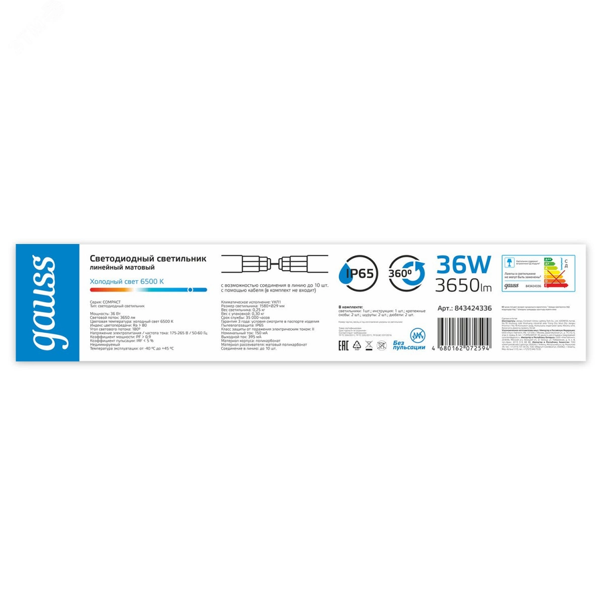 Светильник линейный ДСП 36 Вт 6500К 3650 лм 175-265В IP65 1580х29х29мм Пластик матовый сквозная проводка соеденяется в линию COMPACT Gauss