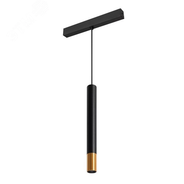 Светильник подвесной для магнитных треков шириной 25мм, 5Вт. Цвет свечения ТЕПЛЫЙ 3000K, световой поток 300лм, угол 45 градусов , CRI-90. Корпус цилиндрический, металл, цвет черный с золотой вставкой, IP20. Размер светового модуля 30*300 мм, размер установочного модуля 200*20*25мм, длина подвеса 1400 мм. Входное напряжение DC24V, мощность 5Вт. Драйвер DС24V/AC230V поставляется отдельно. Диммируется только с 026407, 027633.
