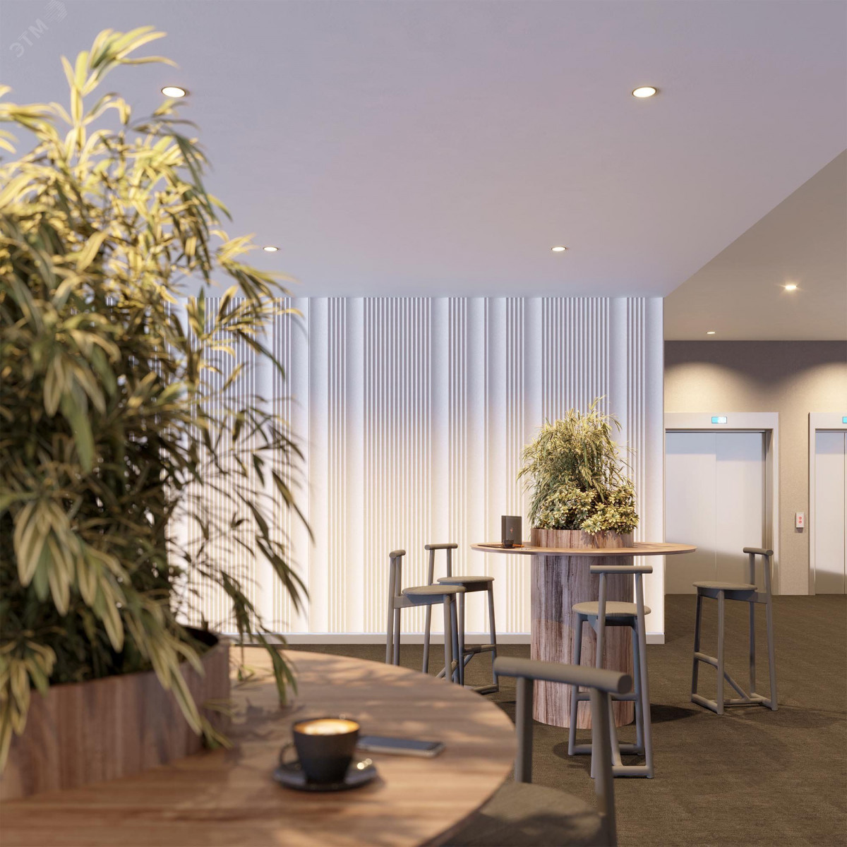 Встраиваемый круглый светильник с индексом цветопередачи CRI 90 и низкой пульсацией обеспечивает равномерное освещение без мерцания и видимости точек светодиодов с точной передачей цветовых оттенков. Алюминиевый корпус белого цвета с утопленным светодиодным модулем является интересным дизайнерским решением, создавая эффект света из ниоткуда и делая освещение комфортным для глаз. Особая конфигурация корпуса позволяет эффективно отводить тепло и продлевает срок службы светодиодов. Светильник с широким углом излучения 90 градусов и световой эффективностью 70 лм/Вт подходит для качественного основного освещения. Легко устанавливается с помощью пружин в монтажное отверстие. Драйвер поставляется в комплекте и позволяет быстро подключать светильник напрямую к сети переменного тока 230 В. Диммрование возможно при замене штатного драйвера. Степень защиты от пыли IP20 позволяет применять модель в жилых, коммрческих, торговых и других помещениях, где отсутствует контакт с водой.