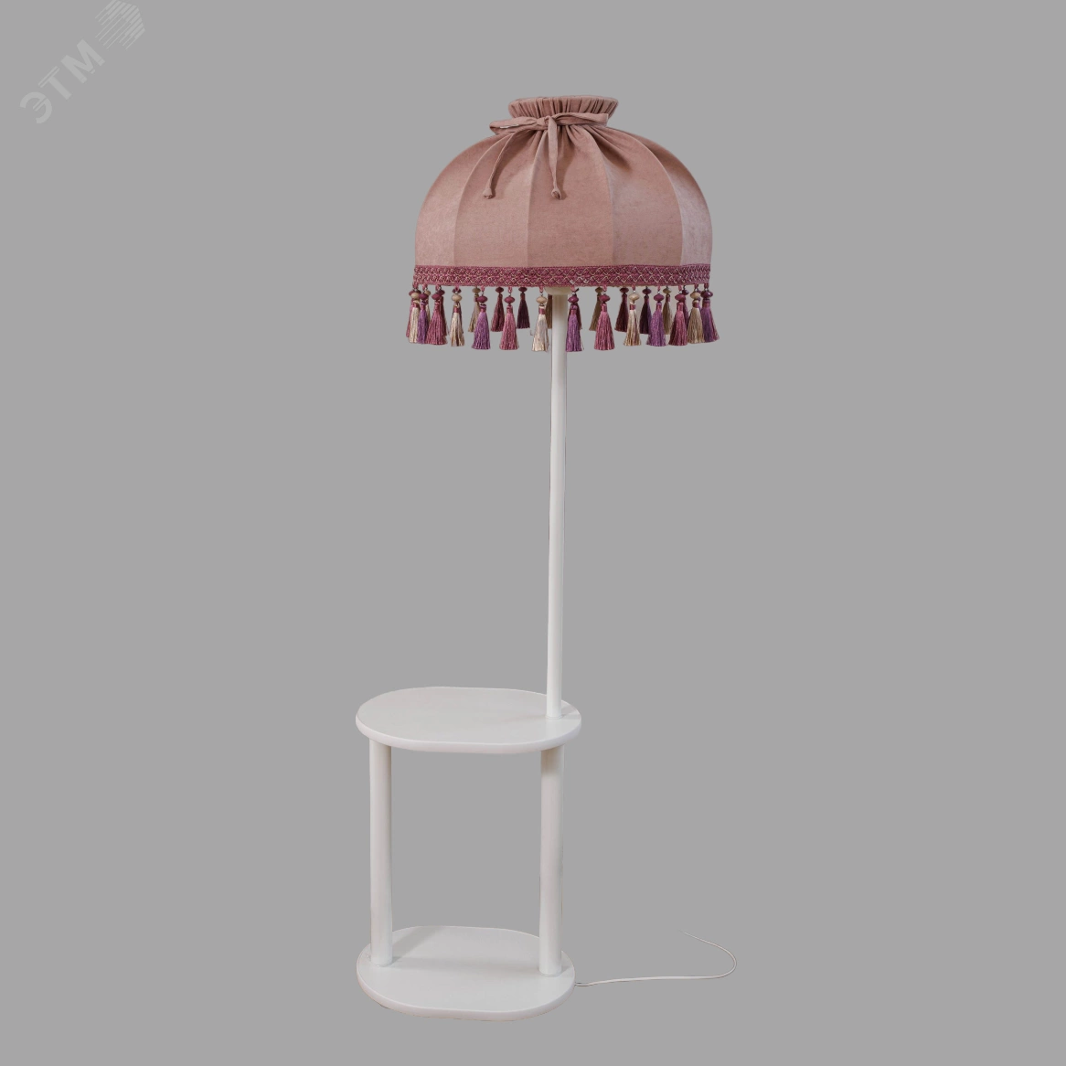 БЕЛЫЙ ТОРШЕР С ОВАЛЬНЫМ СТОЛИКОМ и абажуром, украшенным кистями и бусинами, сделает любой интерьер праздничным и торжественным. Вы по достоинству оцените его удобство. Поставьте такой светильник у кровати или рядом с любимым креслом – необходимые вещи всегда будут у Вас под рукой. А мягкий, рассеянный свет торшера подарит уют. ГАБАРИТЫ торшера – 157*58*49 см, столик овальной формы – 30*40 см, длина шнура – 185 см. АБАЖУР – из современной ткани канвас, бархатистой на ощупь. Цвет абажура – пыльная роза, мягкий, благородный, приглушенный оттенок розового. Абажур декорирован тесьмой с кистями и бусинами. СТОЛИК-ОСНОВАНИЕ – из ЛДСП белого цвета. СТОЙКА из стали также окрашена в белый цвет.