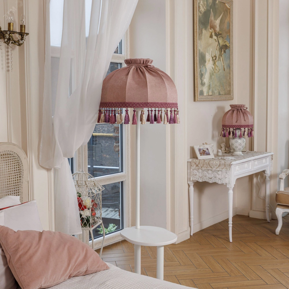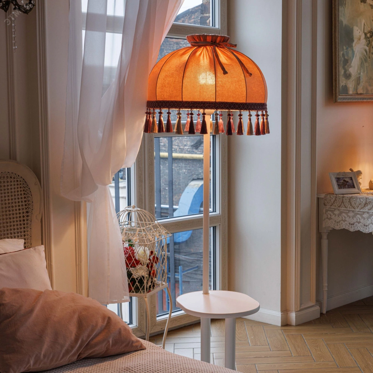 Светильник напольный НТБ 11-60-103 со столиком белый абажур ретро прямой пыльная роза кисти