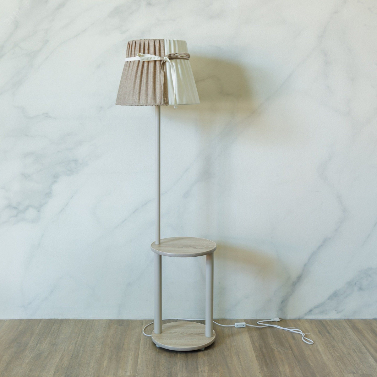 ТОРШЕР СО СТОЛИКОМ - функциональный предмет интерьера. Поставьте его рядом с любимым креслом, необходимые вещи всегда будут у Вас под рукой. ГАБАРИТЫ ТОРШЕРА 154*51*42 см, столик круг d-34 см. АБАЖУР - из льняной ткани, с характерной рельефной фактурой. Комбинация цветов, шампань и капучино, придает ему современный вид. По желанию Вы сможете чуть изменить свой интерьер, повернув абажур светлой или темной стороной, а можно остановится посередине и насладится их гармоничным сочетанием. Крой абажура можно стирать в ручном режиме при 30 градусах. СТАЛЬНАЯ СТОЙКА бежевого цвета соединяет акцентный абажур с столиком. СТОЛИК - из качественной ЛДСП, цвета Дуб Бардолино. Специальная технология позволяет воссоздать натуральную структуру дерева, шероховатую и приятную на ощупь. Такой торшер станет интересным акцентом в пространствах различных стилей, скандинавском, лофт, классическом или кантри.