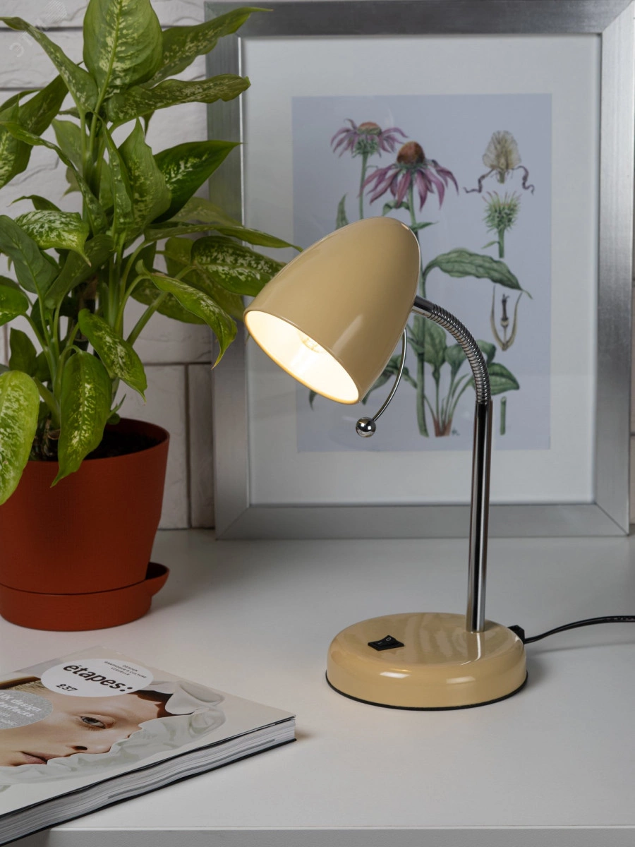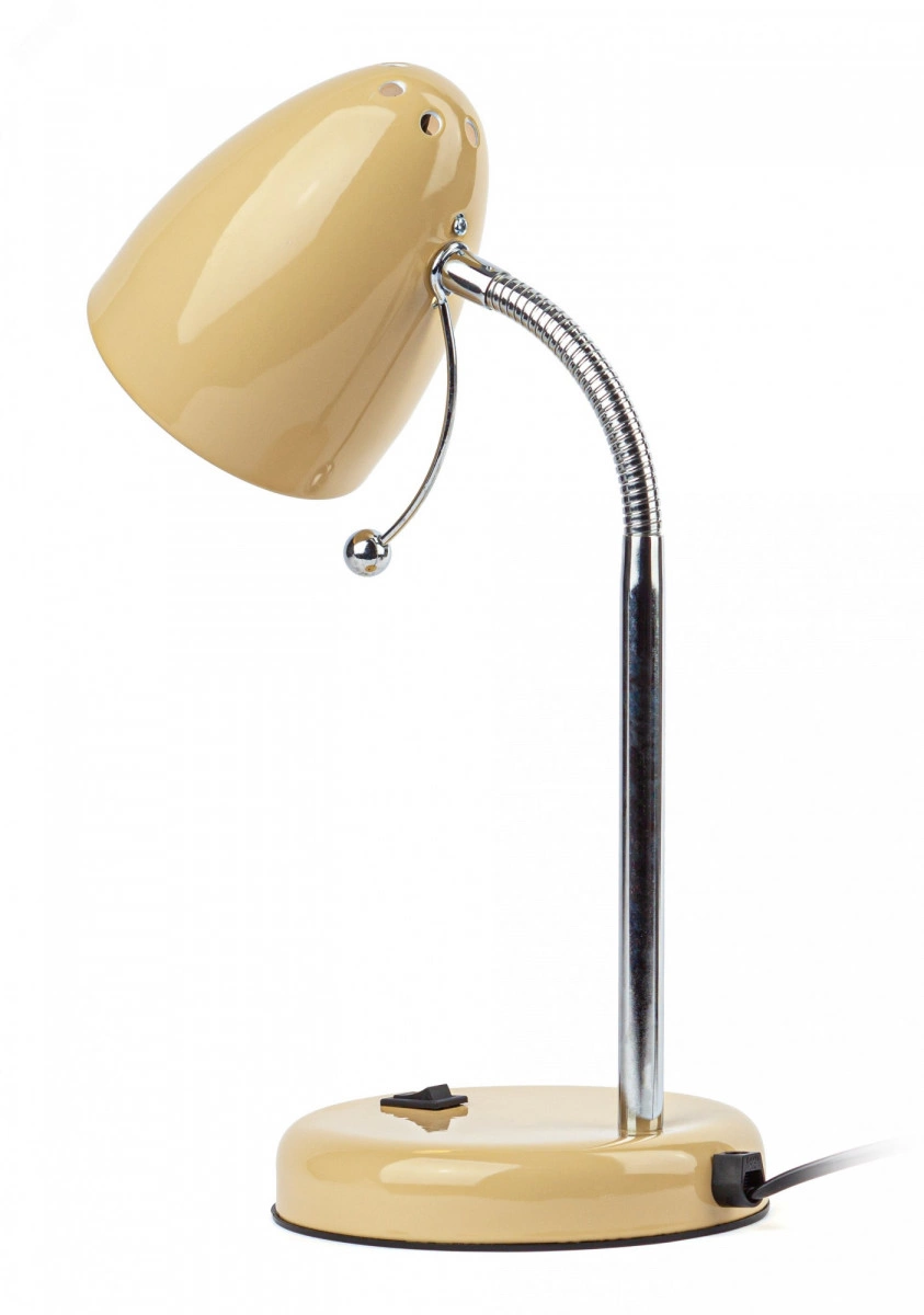 Настольный светильник ЭРА N-116-Е27-40W-BG с цоколем Е27 компактного размера для удобного размещения на столе. Может использоваться с лампой накаливания, компактной люминесцентной лампой (КЛЛ) или светодиодной (LED) лампой. У светильника металлические стойка и плафон, выключатель на основании. Высота расположения плафона регулируется сгибающейся стойкой, направление света - наклоном и поворотом плафона в любом направлении.