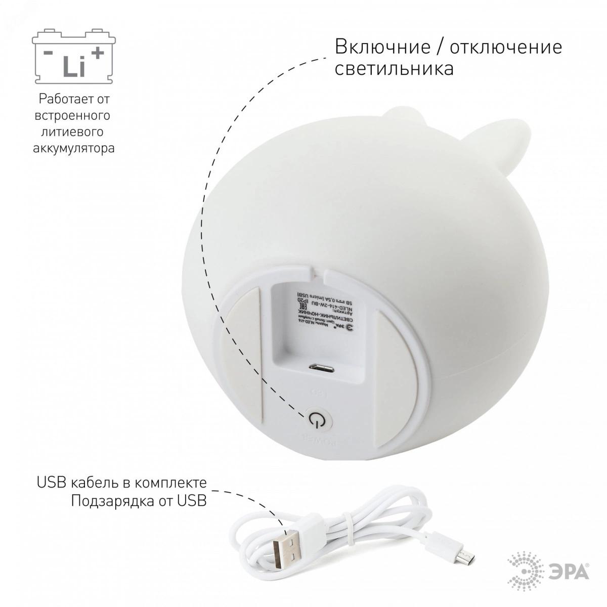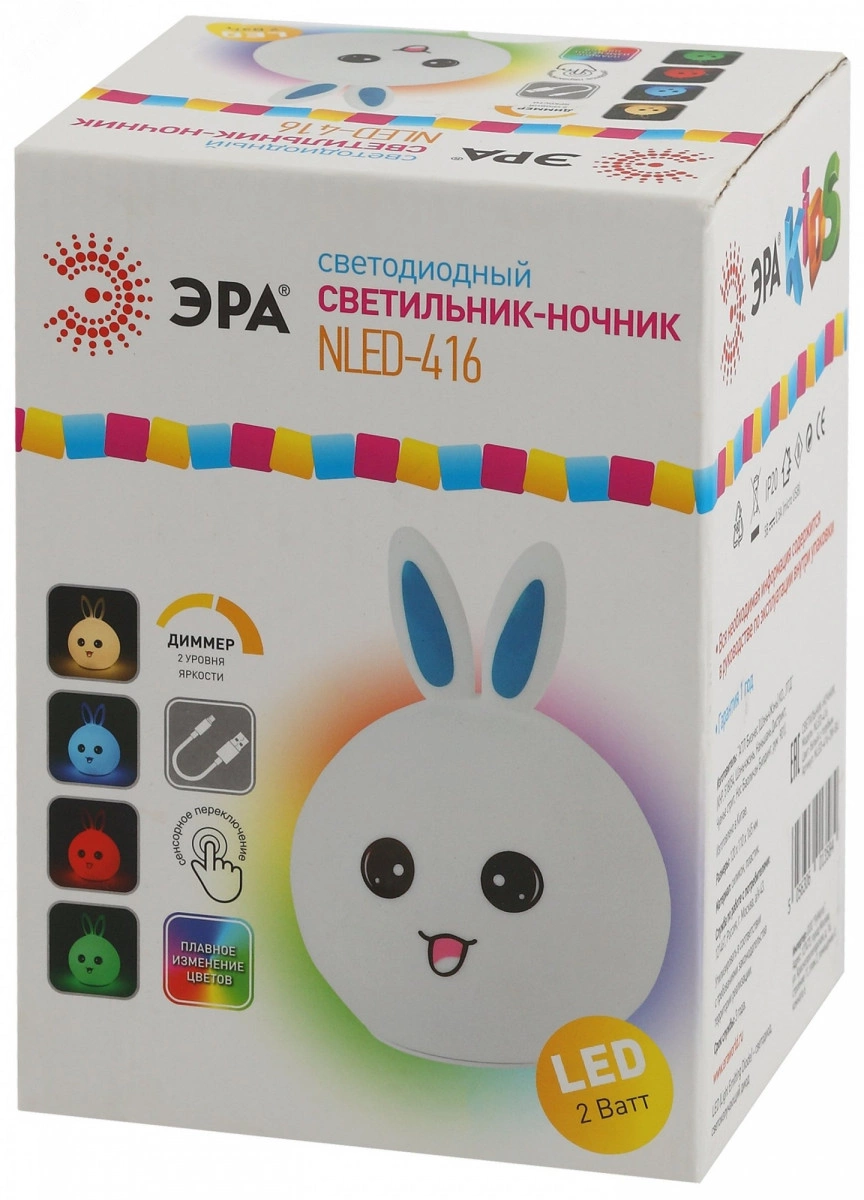 Силиконовая игрушка-ночник ЭРА NLED-416-2W-BU в виде зайчика с восхитительной улыбкой. Эта вещь легко впишется в декор спальни, поможет малышу быстро заснуть и сделает уютным интерьер. У светильника-ночника несколько режимов: белый, красный, зеленый или синий цвет свечения на выбор, а также завораживающая смена ярких цветов. Выбирать тип света можно через касание - а делать это вдвойне удобно за счет нежного силикона. Ребенок может мягко сжимать игрушку при переключении цветов: она поможет снять стресс после изнурительного дня. Аккумуляторная лампа-ночник не зависит от проводов: подзарядите его, а потом возьмите с собой в детскую комнату или поставьте в спальню на тумбочку. Выбрав нашего Зайчика, Вы получите идеальный презент и для себя, и для своего непоседы. Найдите место для верного друга у себя дома!