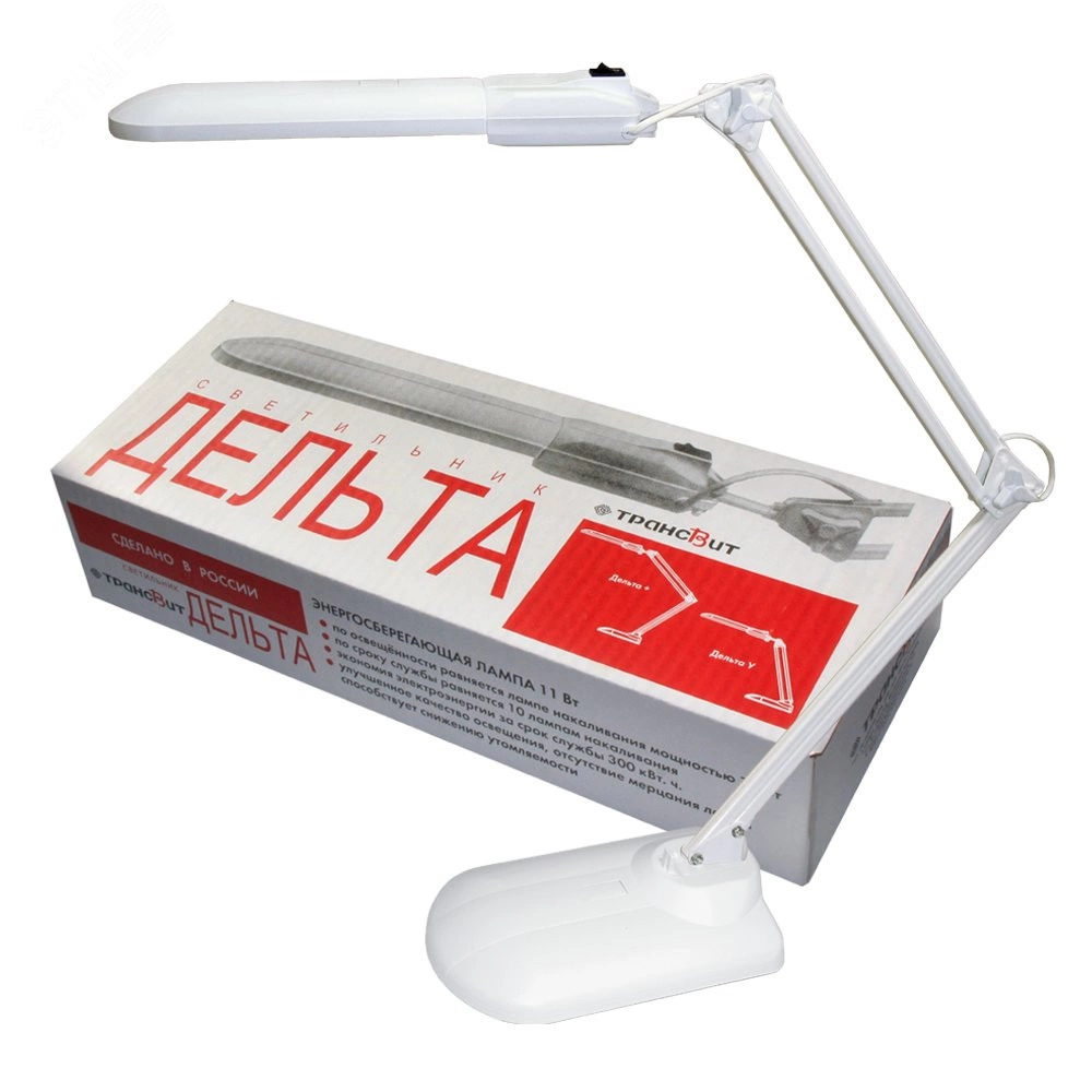 Настольный светильник `Дельта +` с компактной люминесцентной лампой для создания высокого светового комфорта на учебных и рабочих местах, где выполняются работы высокой точности, при работе с компьютером, в местах чтения и отдыха. Конструкция светильника допускает установку плафона во всех плоскостях.