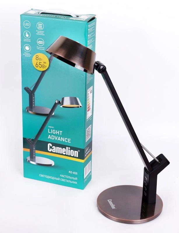 Светильник настольный KD-835 C28 LED 8Вт 230В 480лм сенс.рег.ярк и цвет.темп. USB-5В.1А бронза Camelion 12999