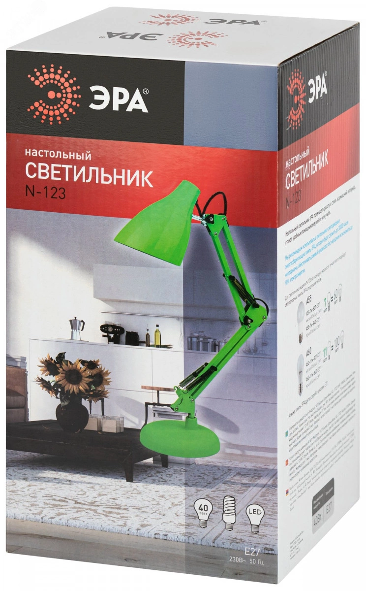 Настольный светильник ЭРА N-123-E27-40W-GR трендового дизайна с классической конструкцией может использоваться с разными источниками света - лампой накаливания, компактной люминесцентной лампой (КЛЛ) или светодиодной (LED) лампой. Выключатель на проводе. Устойчивое основание. Высота плафона регулируется двухсекционной сгибающейся стойкой, направление света - поворотом и наклоном плафона в любом направлении.