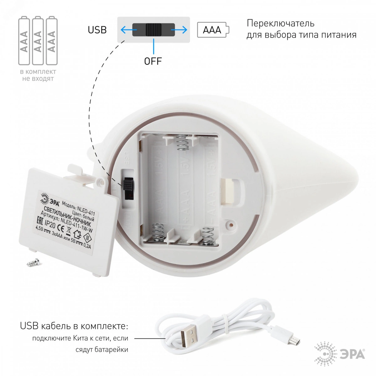 Милый ночник для детей ЭРА NLED-412-1W-W в виде аккуратной фигурки Птички. Такая вещь легко впишется в интерьер за счет универсального дизайна, сделает атмосферу в доме более уютной, а также успокоит ребенка перед сном. У силиконового ночника-светильника 2 режима - постоянный свет и медленное переключение RGB-цветов. Один для спокойной ночи, другой создаст хорошее настроение. Свет регулируется касанием - а делать это приятно за счет мягкого материала. Ваш непоседа может гладить игрушку при включении - она поможет снять стресс после утомительного дня. Светодиодный ночник работает от батареек (не входят в комплект), потому его легко поставить как в спальню на тумбочку, так и унести в детскую комнату. В комплект также входит USB-шнур - подключите Птичку к сети, если сядут батарейки (не входят в комплект) или если розетка Вам удобнее, и просто переключите Птичку выключателем в режим USB.