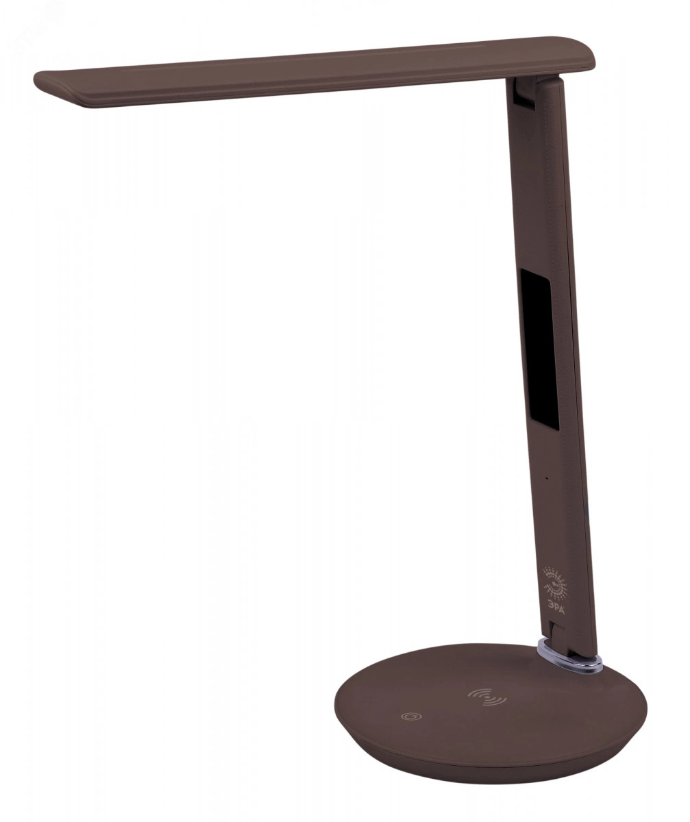 Настольный светильник ЭРА NLED-505-10W-BR со светодиодами (LED) в качестве источников света в дизайне `под кожу`. Удобная складная конструкция с сенсорным управлением, возможностью выбора цветовой температуры и плавным диммером для регулировки яркости. На основании светильника расположен встроенный модуль Qi для беспроводной зарядки мобильных устройств. Просто положите телефон, поддерживающий функцию Qi на основание светильника в отмеченной зоне - светильник подзарядит его. Главное преимущество светильника - многофункциональный дисплей с функциями часов, будильника, календаря и термометра.