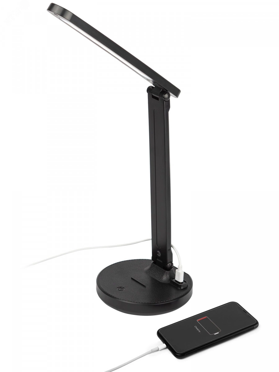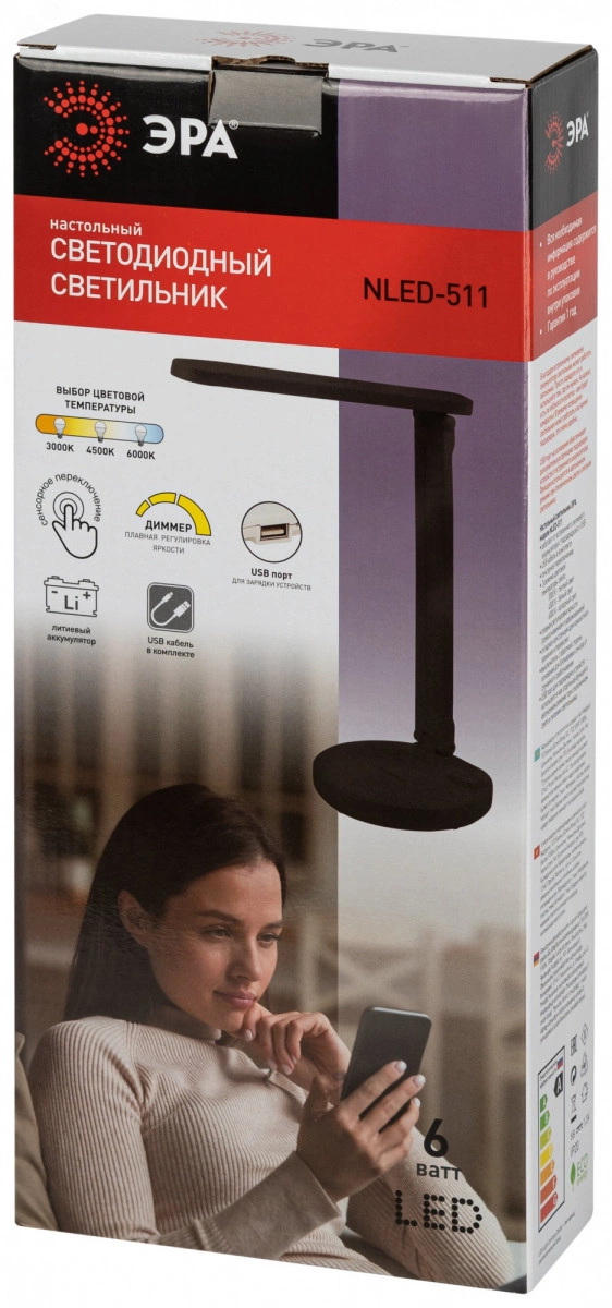 Настольный светильник ЭРА NLED-511-6W-BK со светодиодами (LED) в качестве источников света в дизайне `под кожу`. Встроенный литиевый аккумулятор для автономной работы. Подзарядка от USB. USB-кабель в комплекте. Удобная складная конструкция с сенсорным управлением, возможностью выбора цветовой температуры и плавным диммером для регулировки яркости. На обратной стороне основания расположен выключатель для отключения/блокировки сенсора от случайного включения. В светильник встроена функция power bank - есть USB-порт для подзарядки устройств на основании (именно как power bank, автономно, от сети не подзаряжает). Направление света регулируется наклоном стойки и поворотом панели со светодиодами относительно стойки для максимального комфорта.