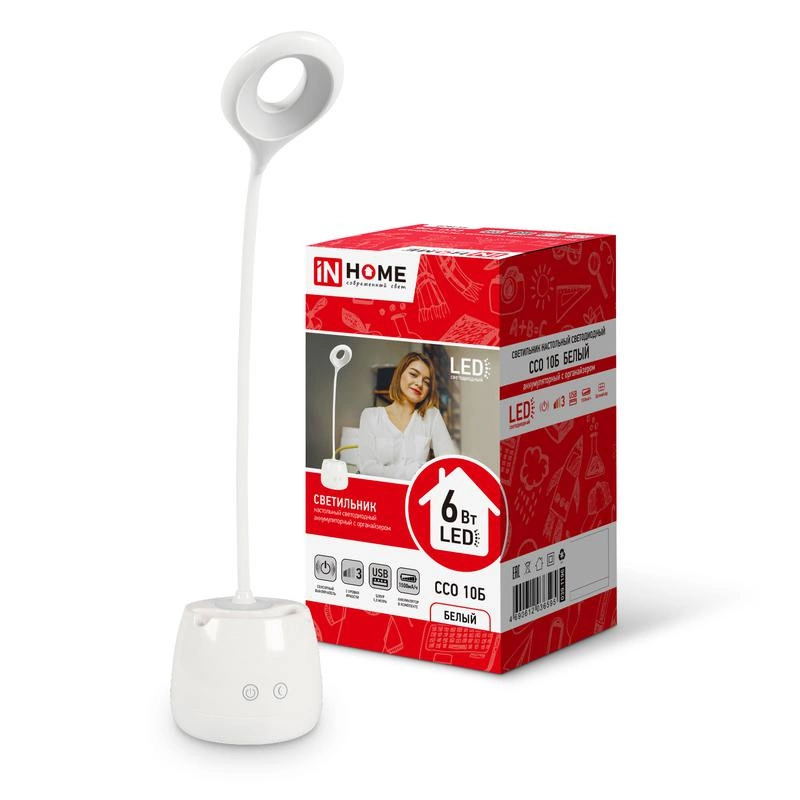 Полное описание: Светильник настольный светодиодный аккум. ССО 10Б 6Вт 6500К 480лм сенсор-диммер с органайзером USB-кабель бел. IN HOME 4690612036595