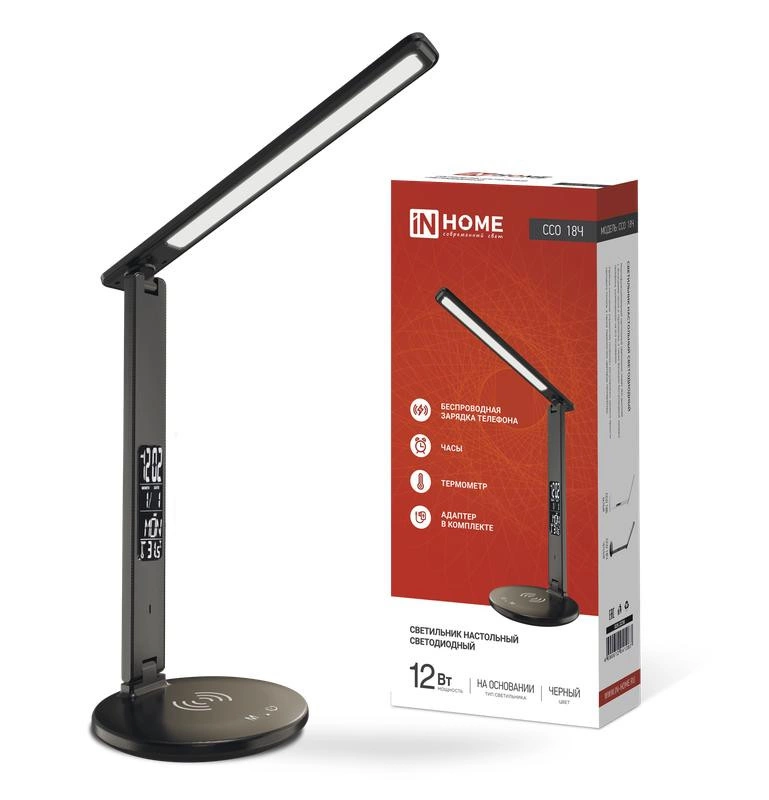 Полное описание: Светильник настольный светодиодный ССО 18Ч 12Вт 3-6.5К 600лм сенсор-диммер часы темп. беспроводн. зарядка с адаптером черн. IN HOME 4690612041087