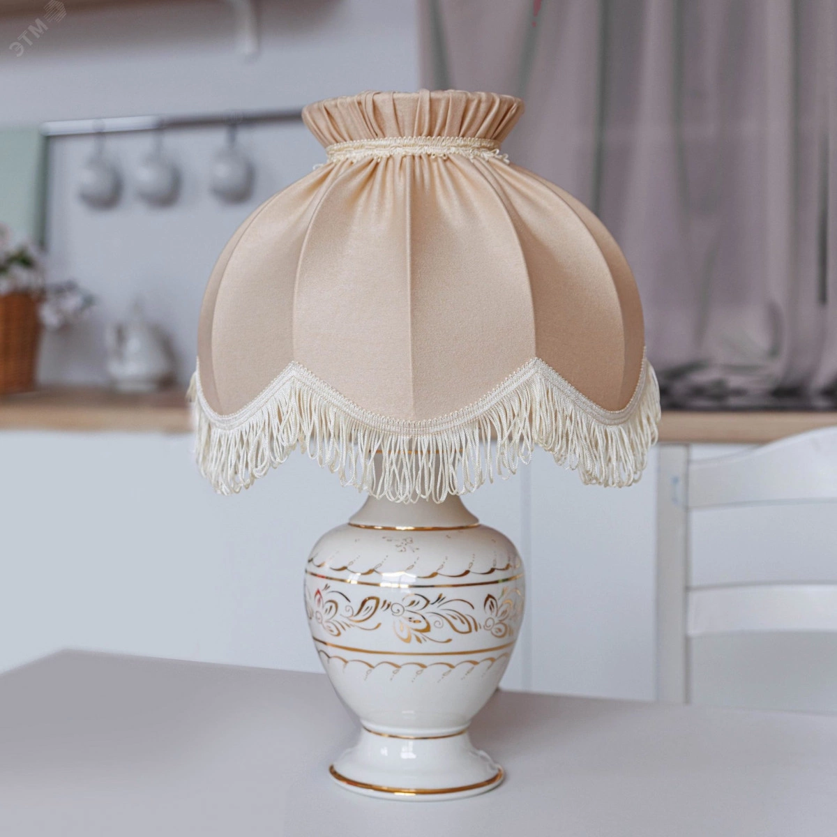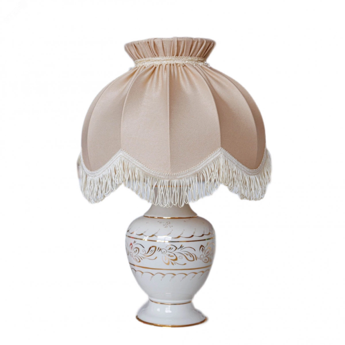 Роскошь и богатство олицетворяют фарфоровые светильники с росписью 24-каратным золотом. НАСТОЛЬНЫЙ СВЕТИЛЬНИК Венера станет украшением Вашего дома. ГАБАРИТЫ. Общая высота — 50 см, высота абажура — 23 см, верхний диаметр абажура — 16 см, нижний диаметр абажура — 31 см. ОСНОВАНИЕ из фарфора исключительного качества расписано 24-каратным золотом вручную мастерами Гжельского завода. Узор каждой фарфоровой детали уникален, поэтому рисунок на изделии может отличаться от представленного на фото. АБАЖУР из мягкой ткани софт декорирован бахромой и тесьмой. ЦВЕТА АБАЖУРА — шампань, светлый и нарядный, как брызги игристого. Он озарит пространство вокруг, сделает его праздничным.