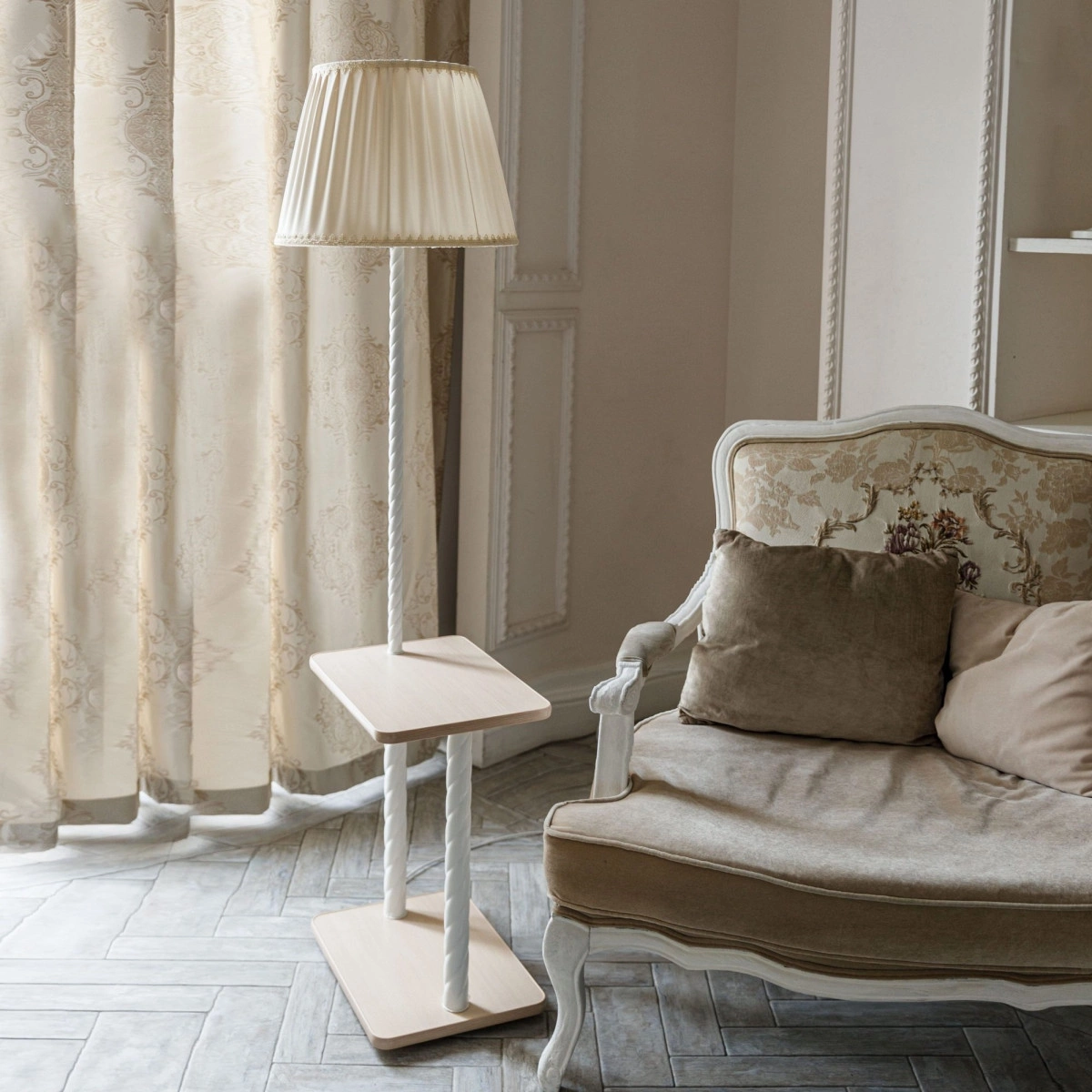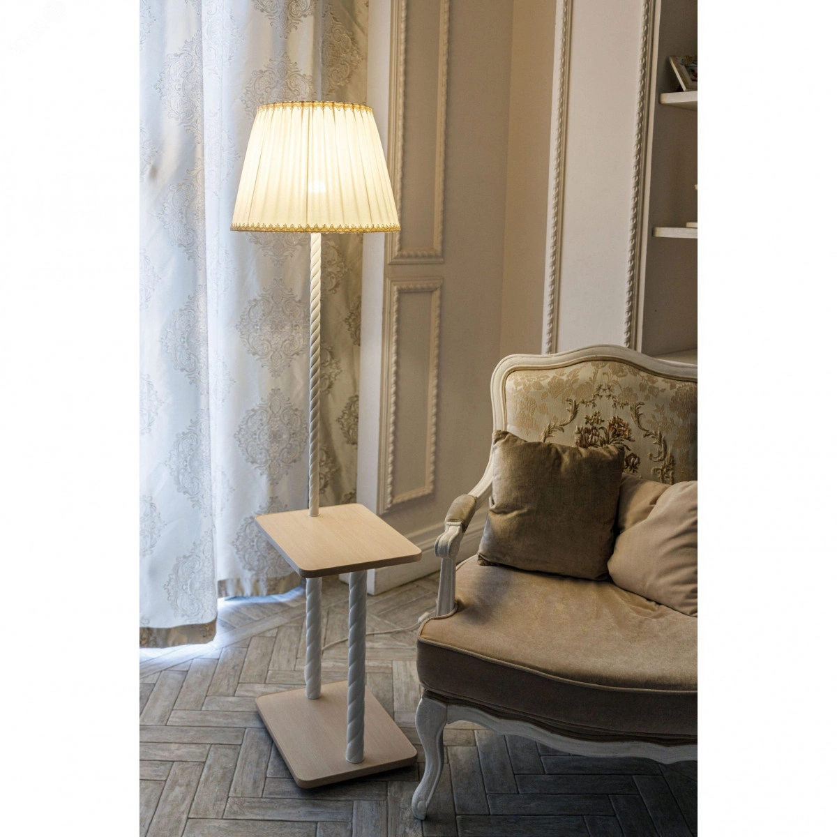 Идеальный светильник для интерьеров в светлых тонах. Сочетание белого и бежевых оттенков – элегантное дизайнерское решение. Мягкий свет торшера озарит пространство вокруг, сделает его торжественным и одновременно уютным. Вы по достоинству оцените удобство светильника со столиком. Поставьте его рядом с любимым креслом, необходимые вещи всегда будут у Вас под рукой. ГАБАРИТЫ – 154*57*42 см, столик прямоугольный – 30*40 см. АБАЖУР – из портьерной ткани цвета шампань, по нижнему и верхнему краям декорирован аккуратной тесьмой. СТОЛИК-ОСНОВАНИЕ – из ЛДСП цвета молочный дуб, его деликатный древесный рисунок сформирован светлыми тонкими, чуть заметными полосами. Стальная витая СТОЙКА окрашена в белый цвет.