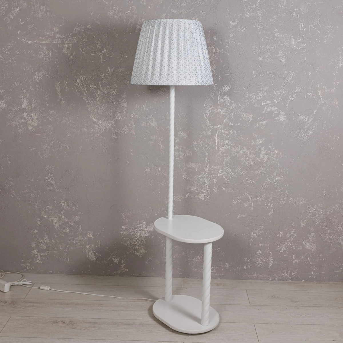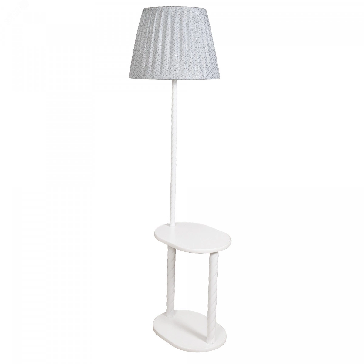 БЕЛЫЙ ТОРШЕР С ОВАЛЬНЫМ СТОЛИКОМ И АБАЖУРОМ ИЗ СЕРЕБРИСТОЙ ПАРЧИ сделает неповторимым Ваш интерьер! Деликатное сияние серебра ассоциируется с солнечным зимним утром или таинственным снежным вечером. Есть в его отблесках благородная красота и природная загадка. Серебристый цвет в интерьере – сверкающий отголосок из мира аристократов и дворцовых балов, сдобренный современным шиком. ГАБАРИТЫ – 154*57*42 см, столик овал – 30*40 см. АБАЖУР – из роскошной серебристой парчи. Ненавязчивый блестящий рисунок в виде ромбов напоминает морозный узор, а, может, поляну первых подснежников. Включите свет, и абажур засверкает, озаряя все вокруг волшебным сиянием. СТОЛИК-ОСНОВАНИЕ – из ЛДСП белого цвета. Вы по достоинству оцените его удобство. Поставьте светильник у кровати или рядом с любимым креслом, необходимые вещи всегда будут у Вас под рукой. Стальная витая СТОЙКА окрашена в белый цвет.