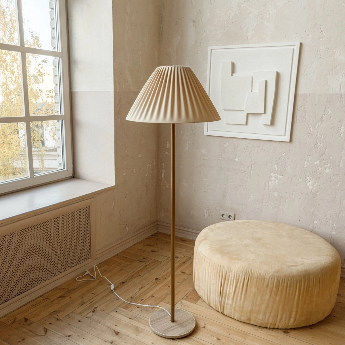 ТОРШЕР АТРИУМ окутает мягким светом пространство вокруг, подарит Вашему дому атмосферу уюта и расслабления. А благодаря продуманному дизайну, станет еще и стильным украшением интерьера. АБАЖУР для торшера выполнен из ткани габардин в спокойном бежевом цвете. Бежевый покорил многие сердца, он не теряет своей популярности уже несколько лет. Универсальность и лаконичность – залог его актуальности в течение еще долгого времени. При этом форма абажура весьма неординарна. Идеальный баланс, оригинально и интересно, вместе с тем элегантно! Крой абажура снимается с каркаса. Допускается стирка в ручном режиме при температуре 30 градусов. Основание – из ЛДСП цвета швейцарский вяз. Стальная стойка окрашена в цвет латунь. ГАБАРИТЫ. Высота — 166 см, нижний диаметр абажура — 54 см, диаметр основания — 30 см, длина шнура – 185 см.