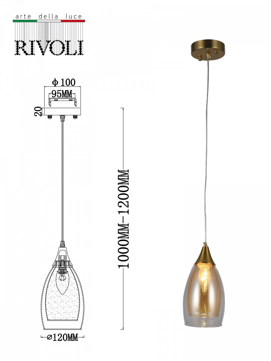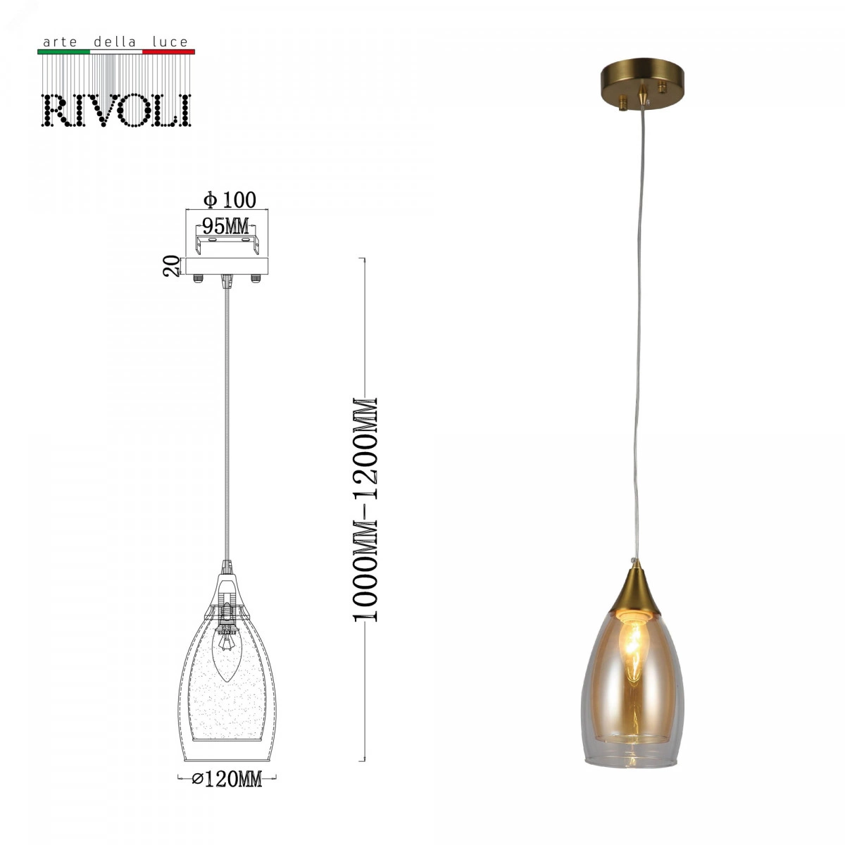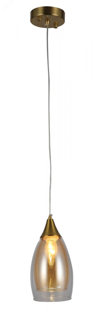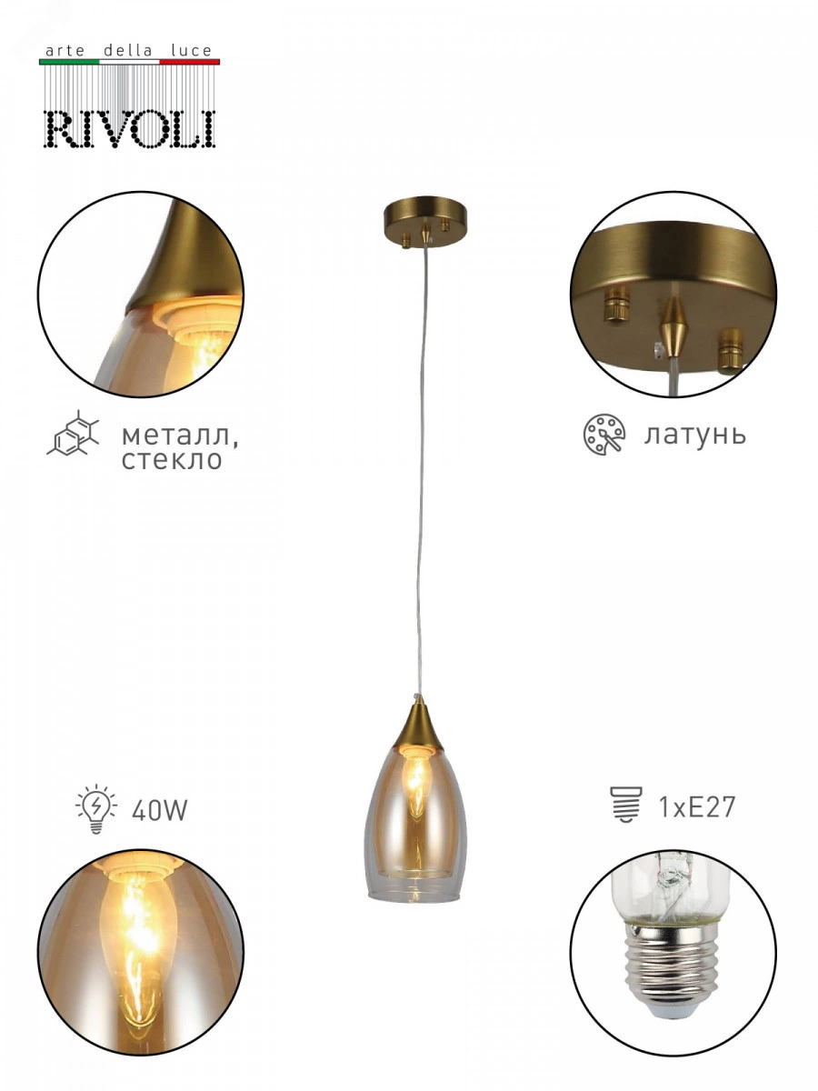Подвесной светильник Rivoli Aileen (арт. 3193-201) под лампу Е27 40 Вт. Светильник потолочный подвесной выполнен в стиле лофт-кантри. Цвет основания и металлической части плафона - латунь. Плафон двухчастный - внутренний из тонированного стекла, внешний - прозрачный. Высота подвеса светильника регулируется. Подвесные светильники с регулировкой длины троса могут применяться с потолками любой высоты и в пространствах любой площади. Один такой светильник освещает до 3 м2. Часто подвесные светильники на тросах монтируются в составе из нескольких штук. Двухцветный плафон придает светильнику-люстре оригинальный внешний вид как в выключенном, так и во включенном состоянии.