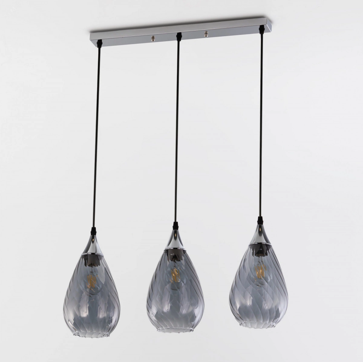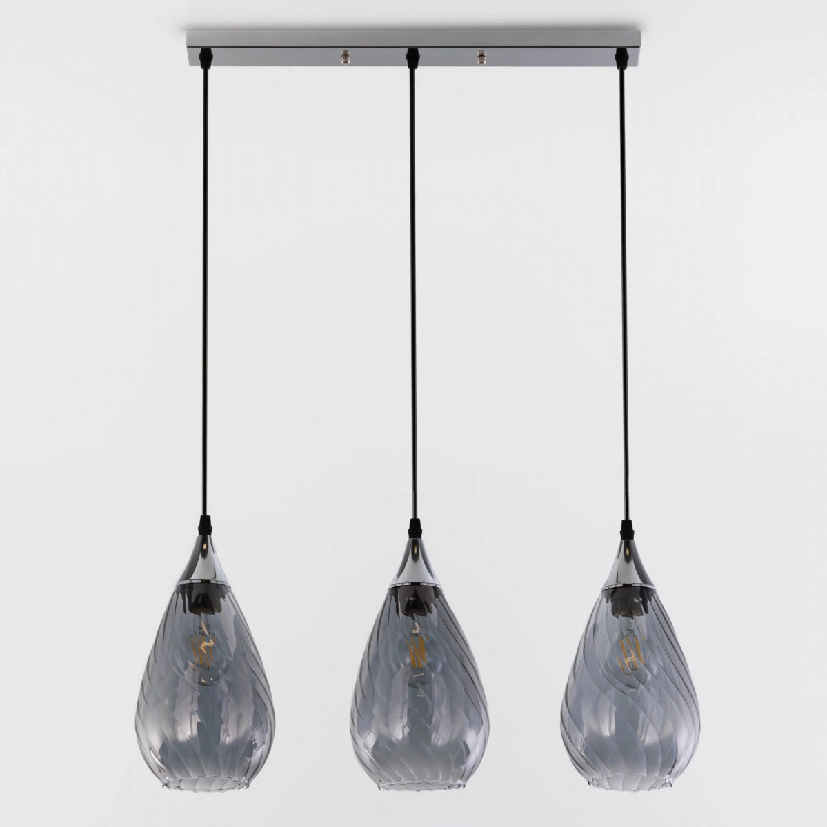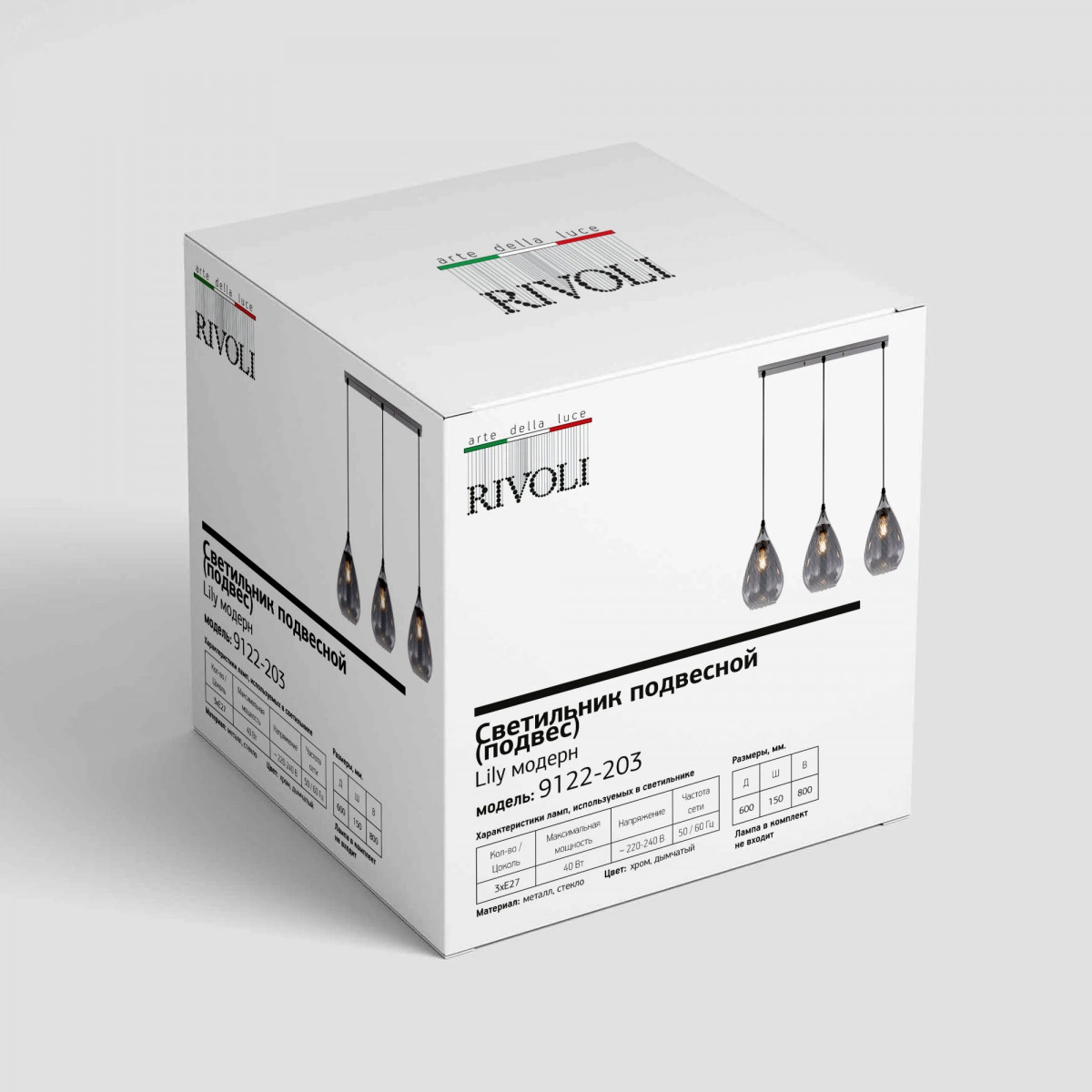 Rivoli Lily (арт. 9122-203) - подвесной светильник с хромированным металлическим основанием и 3 фигурными плафонами из дымчатого стекла. Светильники потолочные подвесные Lily созданы итальянским брендом Rivoli в популярном стиле модерн. Стекло плафонов закалено. Такие подвесные светильники станут превосходным решением для размещения над столом или барной стойкой. Высоту тросов каждого из трех плафонов можно отрегулировать при монтаже. Если вы ищете подвесные светильники для кухни или подвесные светильники в прихожую, стоит заказать эту оригинальную стильную модель. Lily Rivoli - подвесные светильники на надежных тросах. Рекомендуемые источники света - Е27 мощностью 40 Вт. Один светильник подвесной Lily хорошо подсвечивает площадь 9 м2. Дымчатые стеклянные плафоны в форме капель смягчают яркость светового потока, делая освещение комфортным для глаз.