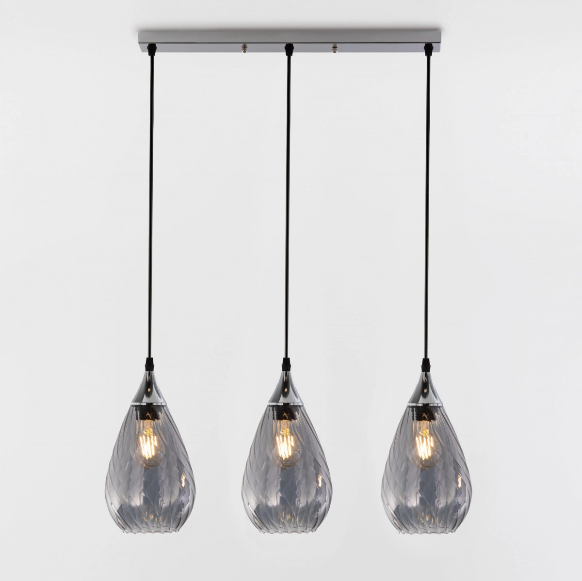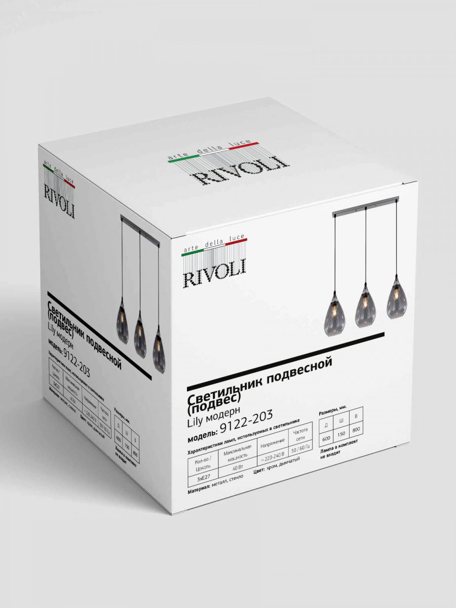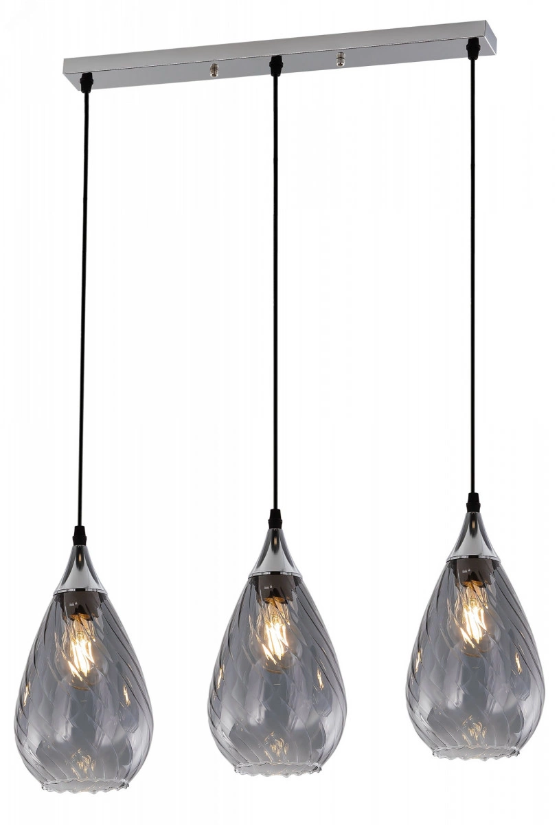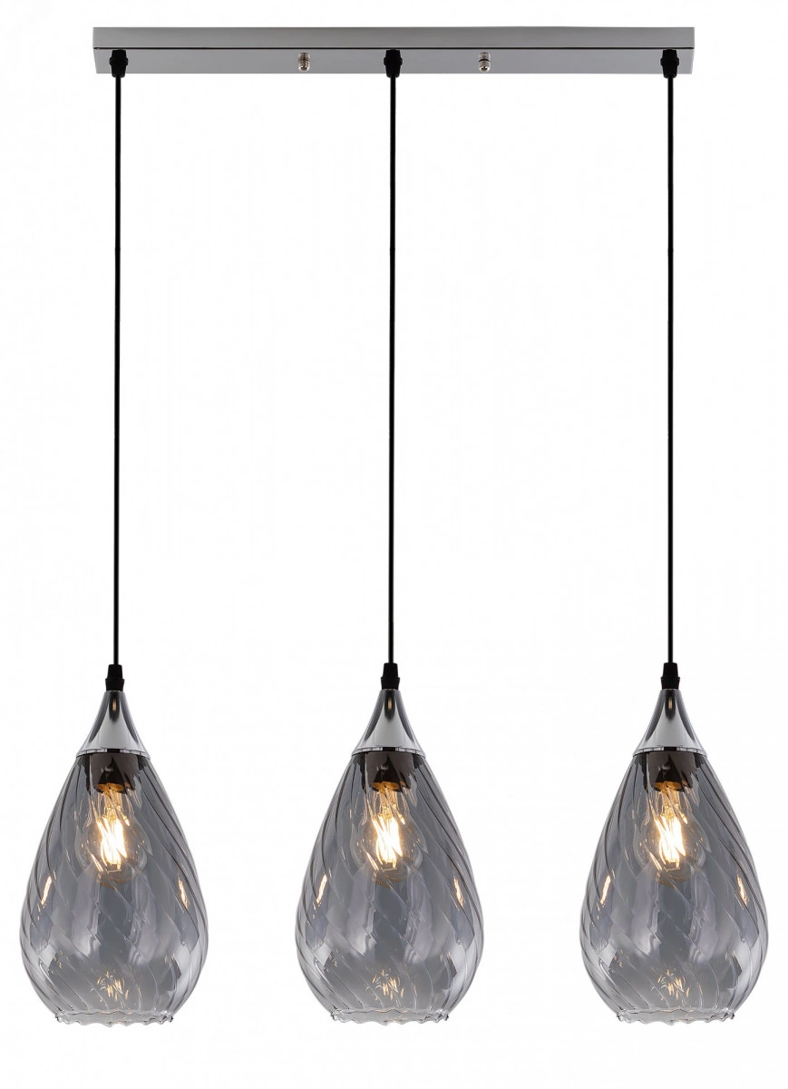 Rivoli Lily (арт. 9122-203) - подвесной светильник с хромированным металлическим основанием и 3 фигурными плафонами из дымчатого стекла. Светильники потолочные подвесные Lily созданы итальянским брендом Rivoli в популярном стиле модерн. Стекло плафонов закалено. Такие подвесные светильники станут превосходным решением для размещения над столом или барной стойкой. Высоту тросов каждого из трех плафонов можно отрегулировать при монтаже. Если вы ищете подвесные светильники для кухни или подвесные светильники в прихожую, стоит заказать эту оригинальную стильную модель. Lily Rivoli - подвесные светильники на надежных тросах. Рекомендуемые источники света - Е27 мощностью 40 Вт. Один светильник подвесной Lily хорошо подсвечивает площадь 9 м2. Дымчатые стеклянные плафоны в форме капель смягчают яркость светового потока, делая освещение комфортным для глаз.