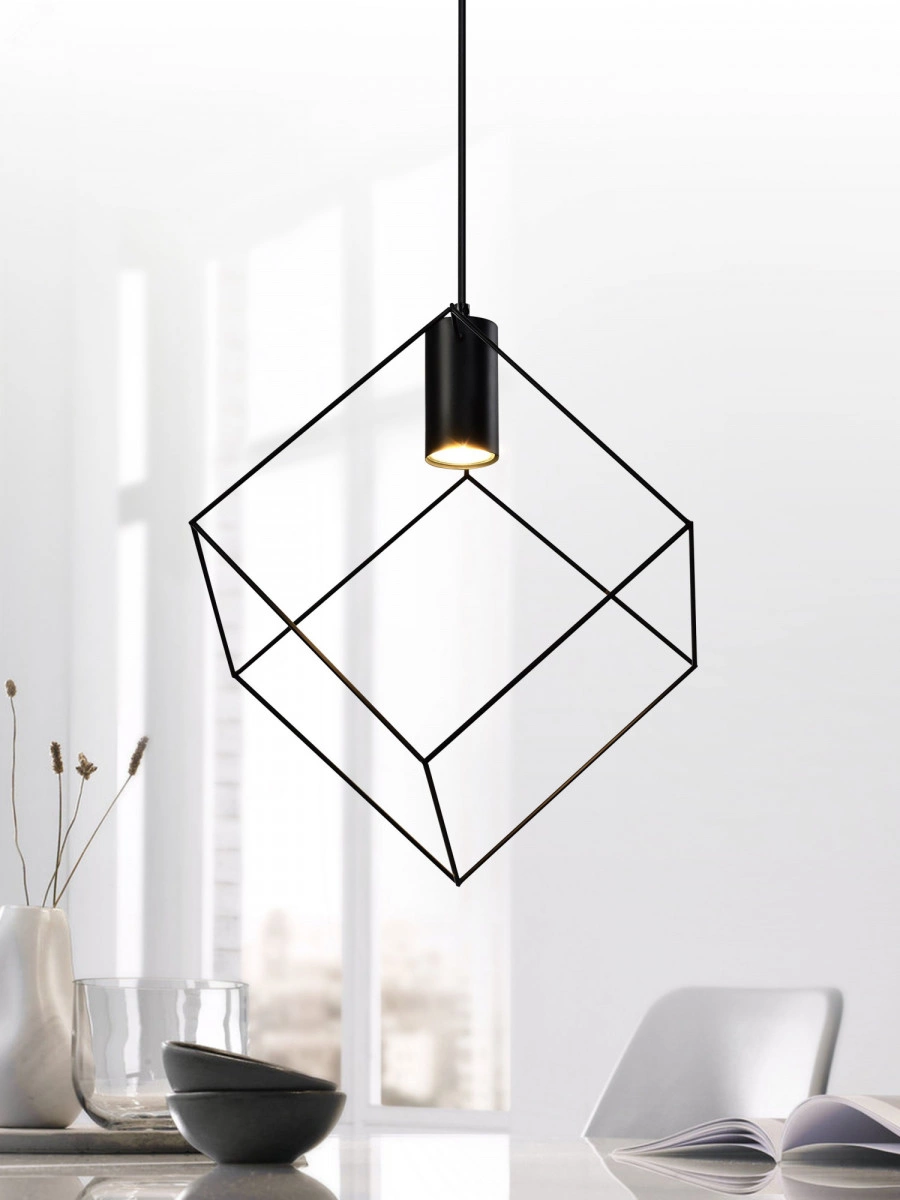 Rivoli Ella - геометричный подвесной светильник с абажуром в виде металлического куба. Металлические светильники потолочные подвесные - прекрасное решение для кухни, прихожей, для стилей лофт, минимализм. Подойдут такие подвесные светильники на тросах в детскую комнату для подростка, в молодежную квартиру-студию. Подвесные светильники Ella, размещенные над столом - отличная дополнительная подсветка столешницы. Хорошее интерьерное решение - купить несколько подвесных светильников Ella и подвесить их в один ряд либо группой. Аккуратный патрон подвесного светильника-люстры Ella Rivoli предназначен для лампы GU10 25 Вт. Подвесные светильники Ella Rivoli выполнены в базовом черном цвете. Металл корпуса легкий и прочный, высококачественный провод.