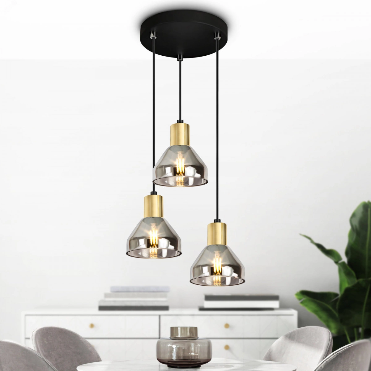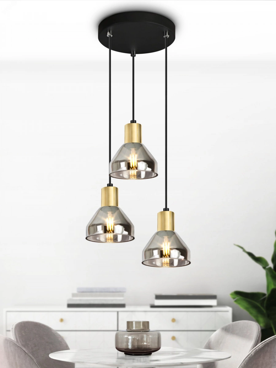 Светильники потолочные подвесные Kassandra от итальянского бренда Rivoli созданы в стиле модерн. Такие подвесные светильники стоит купить для классической или современной кухни, гостиной, спальни. Вполне подходят такие светильники подвесные и для популярного стиля лофт. Подвесные светильники Kassandra часто выбирают, чтобы разместить над столом - они отлично подсвечивают столешницу.  Данный светильник подвесной с 3 дымчатыми стеклянными плафонами - дизайнерское решение для зонирования пространства или организации дополнительного освещения. Плафоны расположены на разных уровнях, что придаст вашему интерьеру изюминку. Высоту каждого плафона можно отрегулировать при монтаже светильника.