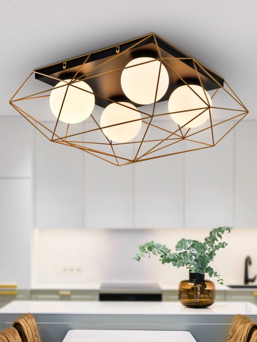 Rivoli Raila - дизайнерский светильник потолочный под 4 лампы Е14 40 Вт. Эффектно выглядит за счет сочетания металлического каркасного корпуса и уютных круглых плафонов из белого стекла. Потолочный светильник Raila освещает площадь 12 м2. Такой светильник потолочный идеален для кухни или гостиной с невысокими потолками. Стоит купить для комнат с натяжными потолками. Заказать этот светильник потолочный для прихожей или коридора - удачное решение. Размеры - 600*500*270 мм. Такие светильники - выбор дизайнеров современных интерьеров. Часто их монтируют в комбинациях из нескольких штук. Корпус потолочных светильников Rivoli Raila изготовлен при помощи высокоточной лазерной сварки, арматура имеет стойкое гальваническое окрашивание. Лофт-светильники Raila выполнены в трендовом сочетании золотого и черного цветов.