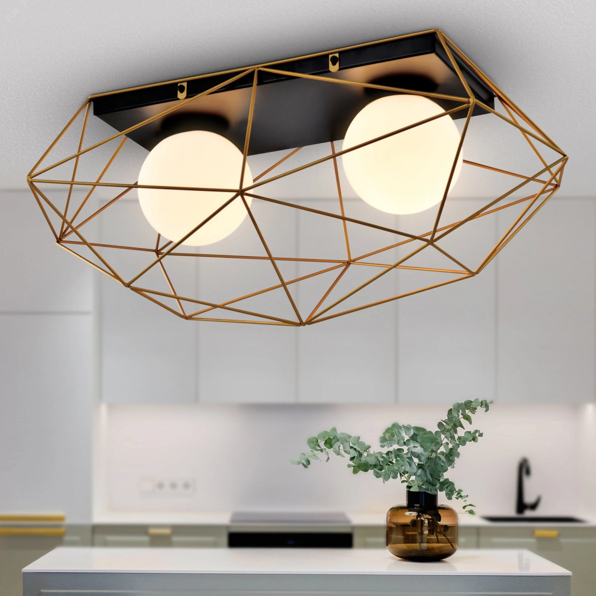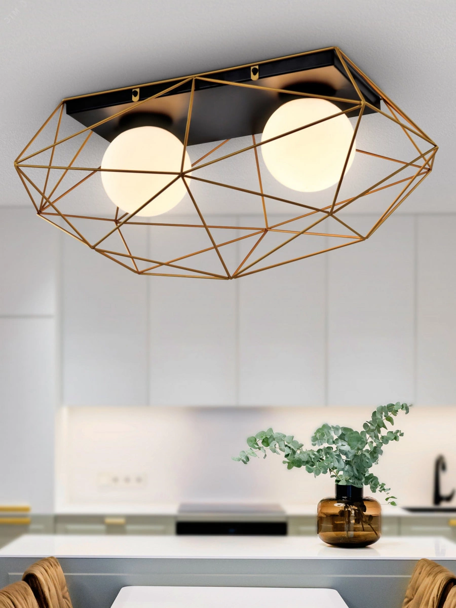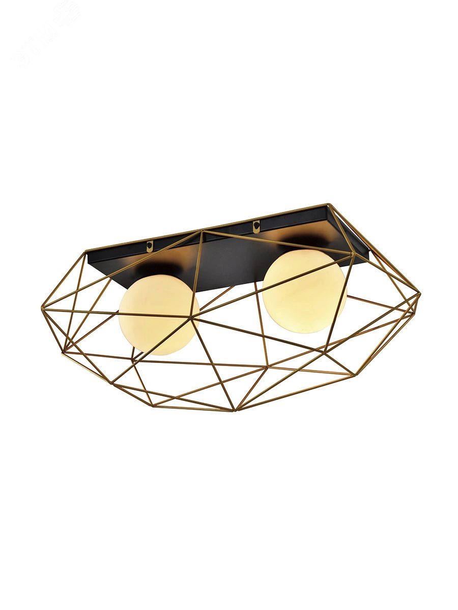 Дизайнерский потолочный светильник Rivoli Raila в геометричном металлическом корпусе. Люстра, созданная итальянскими дизайнерами специально для интерьеров в стиле лофт. В многогранном каркасе из черно-золотой арматуры находятся два белых круглых плафона под лампы Е14 мощностью 40 Вт. Светильник потолочный Raila с двумя лампами освещает площадь 6 м2. Размеры - 600х300х270 мм. Дизайнеры интерьеров выбирают такие светильники для эффектного оформления комнат с невысокими потолками, с натяжными потолками. Отлично смотрятся эти светильники на потолок в комбинациях из нескольких штук. Металлический корпус светильника потолочного Rivoli Raila создан высокоточной лазерной сваркой, арматура окрашена стойким гальваническим способом.