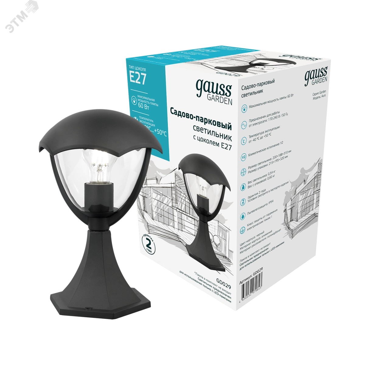 Светильник садово-парковый 60Вт (max) 1хЕ27 на постамент 170-240 В 50Hz IP54 200х200х310 мм Aura Gauss