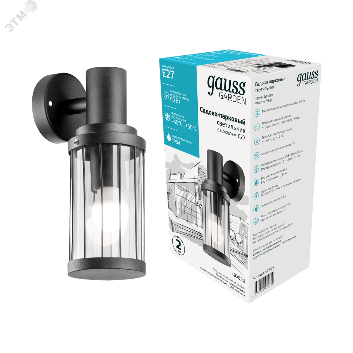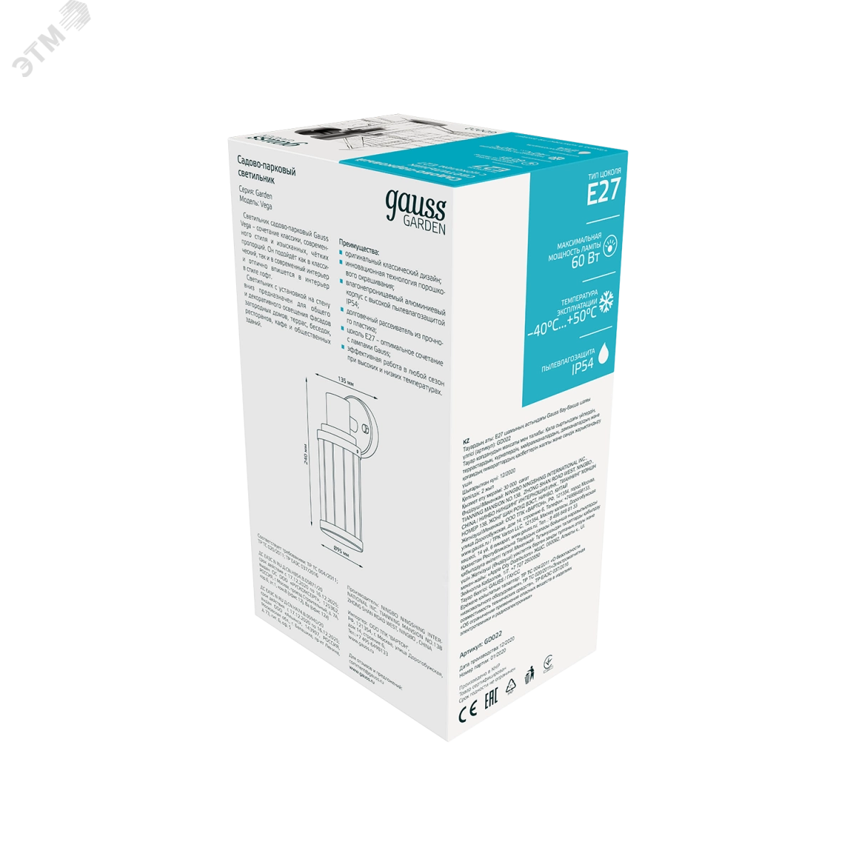 Садово-парковый светильник Gauss серии Vega с установкой на стену вниз станет главным дизайнерским атрибутом на вашем придомовом участке! Светильники Vega, созданные в оригинальном современном стиле, отлично подойдут для общего и декоративного освещения фасадов загородных домов, террас, беседок ресторанов и кафе. Современный ландшафтный дизайн обязательно сочетает базовую и акцентную подсветку, для обеспечения которых прекрасно подойдут садово-парковые светильники Vega с мощностью 60 Вт. Помимо высокой пыле и влагонепроницаемости IP54, светильники имеют устойчивость к погодным условиям от -40°C до +50°C. Используйте садово-парковые светильники Gauss серии Vega с установкой на стену вниз для создания неповторимого стиля вашего пространства.