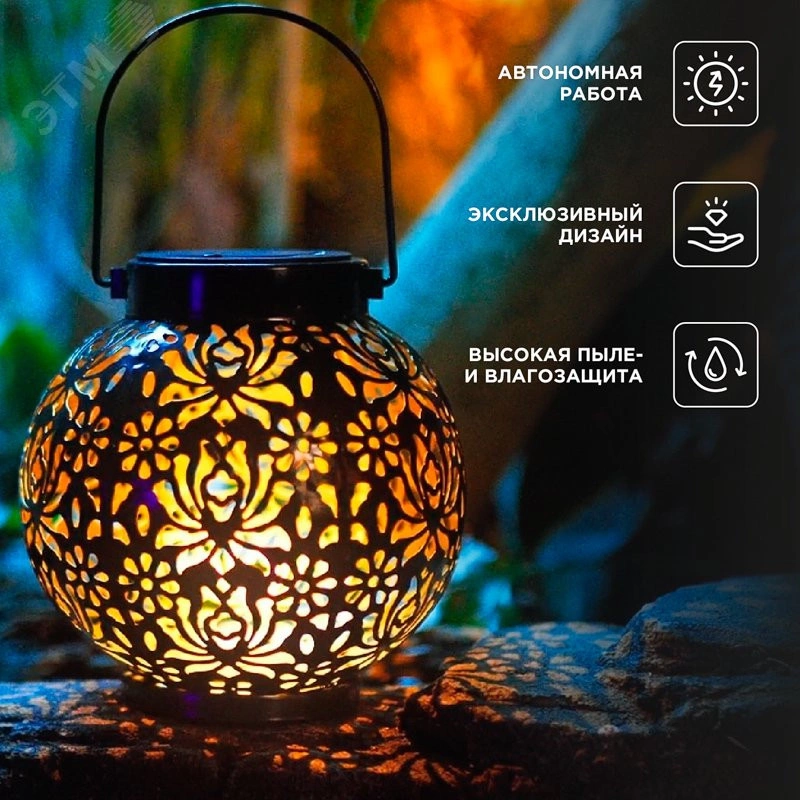 Светильник Шиле – это изысканный элемент садового декора, предназначенный для создания дополнительного освещения или акцентной подсветки. Изделие можно установить на столе в беседке или на веранде, а также подвесить на деревьях, арках или садовых скульптурах. Дизайн светильника вдохновлен богатой историей и культурой Стамбула, что привнесет в ваш сад нотки восточной элегантности и утонченности. Светильник оснащен солнечной панелью, которая поглощает солнечные лучи в течение дня и преобразует их в электрическую энергию. Накопленная энергия хранится во встроенном аккумуляторе, что позволяет светильнику автономно функционировать около 6-8 часов и освещать окружающую территорию вечером и ночью, не требуя подключения к электросети.