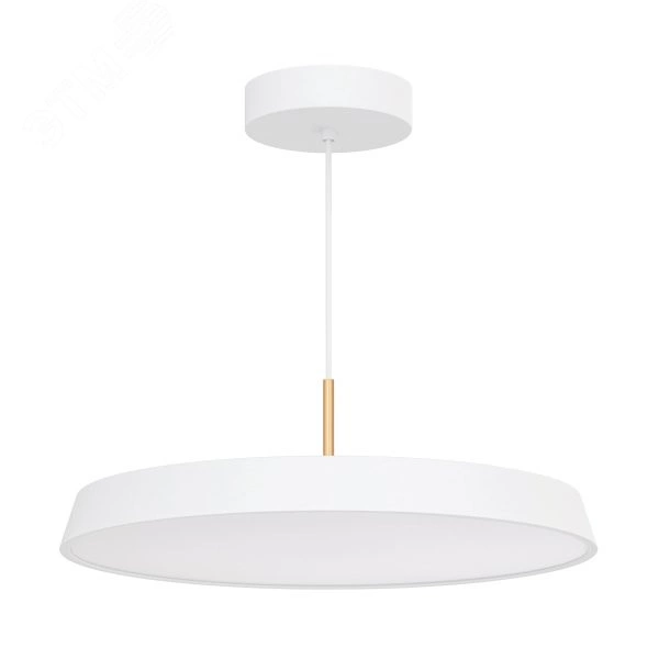 Подвесной светильник. Мощность 37 Вт, св. поток 3071 лм, 83 лм/Вт, теплый 3000 K, CRI-80, угол 120 градусов , напряжение питания 230 В. Белый круглый корпус из стали, экран PMMA, степень защиты IP20. Размер - диаметр 500 мм, высота 50 мм, размер чаши - диаметр 160 мм, высота 35 мм. Монтаж подвесной, длина подвеса 1200мм. Драйвер 40-67 В, 600 мА, пульсация <1%.