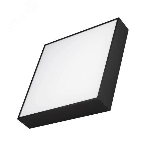 Накладной светильник. Мощность 30 Вт, св. поток 2000-2540 лм, 85 лм/Вт, дневной 4000 K, CRI-90, угол 120 градусов , напряжение питания 230 В. Черный квадратный корпус из алюминия, экран PC, степень защиты IP40. Размер - длина 350 мм, ширина 350 мм, высота 64 мм. Монтаж накладной. Драйвер 27-42 В, 800 мА, пульсация <5%.