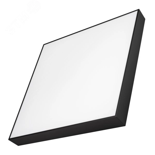 Накладной светильник. Мощность 60 Вт, св. поток 4900-5500 лм, 80-90 лм/Вт, теплый 3000 K, CRI-90, угол 120 градусов , напряжение питания 230 В. Черный квадратный корпус из алюминия, экран PC, степень защиты IP40. Размер - длина 600 мм, ширина 600 мм, высота 64 мм. Монтаж накладной. Драйвер 27-40 В, 1400 мА, пульсация <5%.