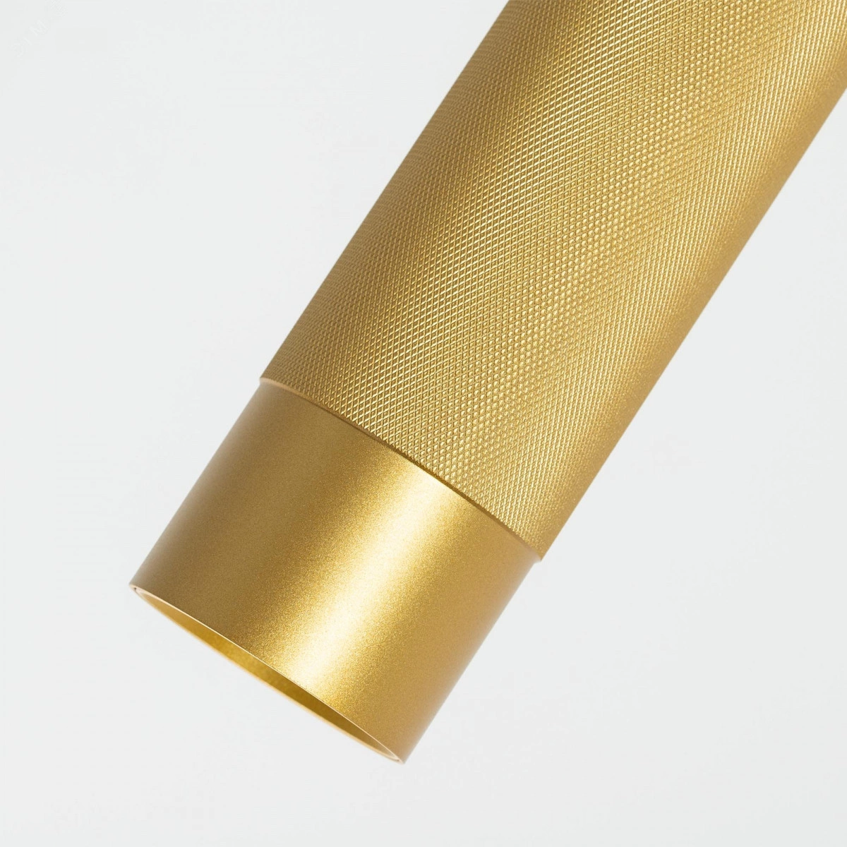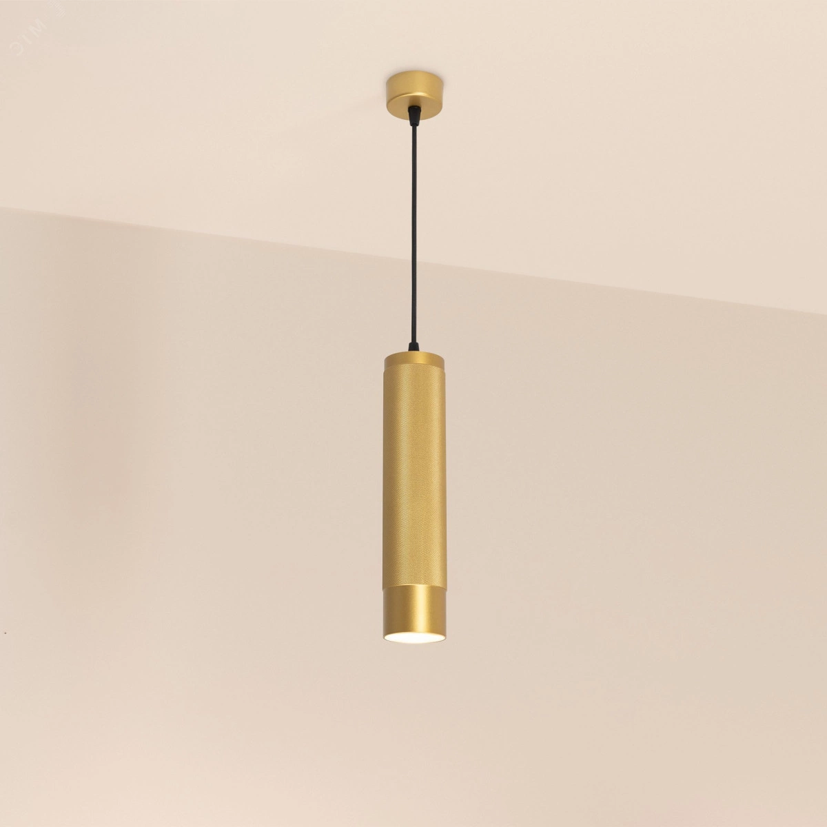 Подвесной светильник. Мощность 13 Вт, св. поток 732 лм, 57 лм/Вт, теплый 3000 K, CRI-90, угол 50 градусов , напряжение питания 230 В. Золотой круглый корпус из алюминия, рефлектор PC, степень защиты IP20. Размер - диаметр 70 мм, высота 300 мм, длина подвеса 1500 мм, размер чаши - диаметр 65 мм, высота 30 мм. Монтаж подвесной. Драйвер 24-42 В, 300 мА, пульсация <1%.