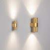 Настенный светильник со свечением в верхнюю и нижнюю полусферу. Мощность 6 Вт, св. поток 350 лм, 60 лм/Вт, дневной 4000 K, CRI-90, угол 40 градусов , напряжение питания 230 В. Золотой фигурный корпус из алюминия, степень защиты IP20. Размер - длина 60 мм, ширина 38,5 мм, высота 104 мм. Монтаж накладной. Драйвер 5-9 В, 700 мА, пульсация <1%.