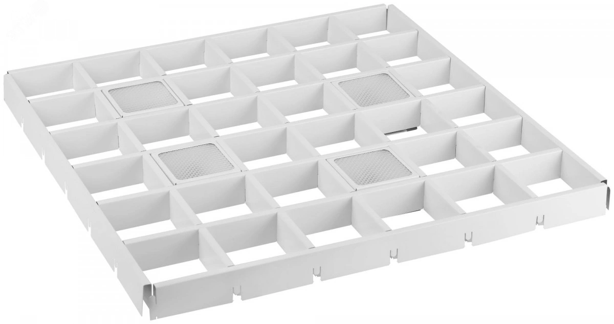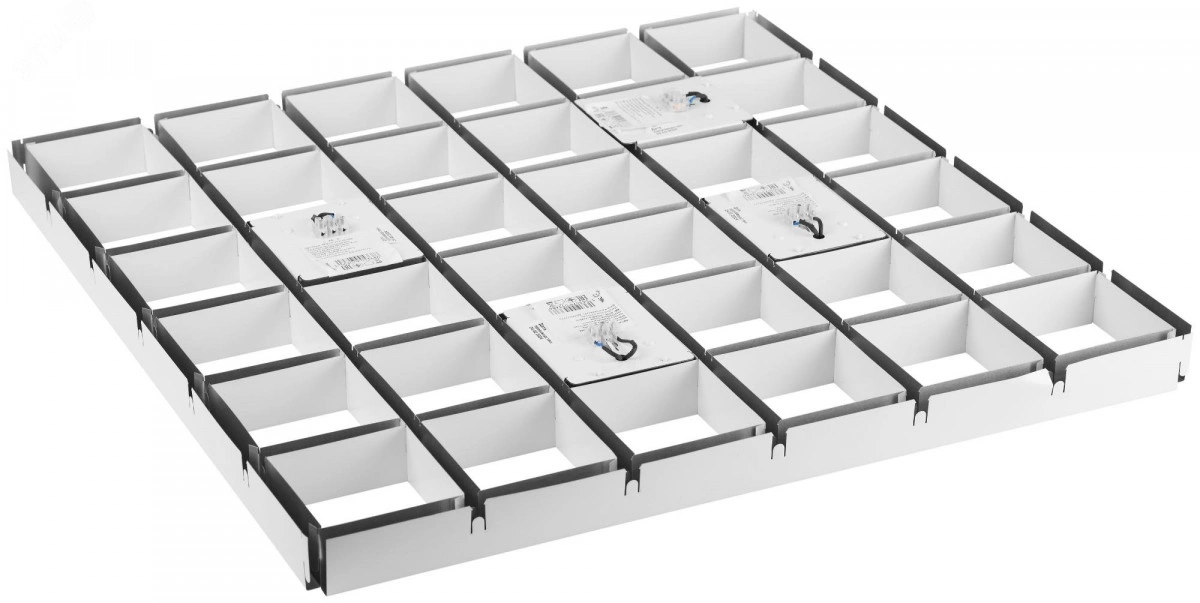 Светильник для потолков Грильято. Устанавливается в ячейку размером 100х100 и высотой профиля 40мм. Внутренний размер ячейки должен быть 90х90мм. Каждый светильник имеет встроенный драйвер, что позволяет подключать его напрямую к сети 220В. Для это предусмотрена винтовая колодка, выведенная на корпус светильника.