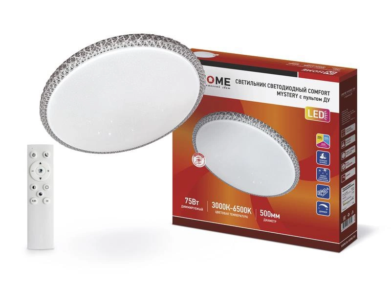 Светодиодный светильник MYSTERY от ТМ INhome в ореоле ограненного «хрусталя» создаст впечатляющий эффект «звездного неба» даже в самом простом помещении, а современная система дистанционного управления повысит уровень домашнего комфорта. Ведь благодаря входящему в комплект пульту, вы сможете регулировать освещение, не вставая с дивана. Красивый, удобный и экономичный светильник излучает равномерный, комфортный для глаз свет, без пульсаций. Пульт дистанционного управления позволяет изменять цветовую температуру от уютного теплого до холодного белого света или приглушить яркость освещения до режима ночника. Холодный дневной свет (6500К) создает яркое контрастное освещение, удобное для работы с мелкими предметами и деталями. Теплый свет 3000К придаст интерьеру уюта и будет способствовать расслаблению в период вечернего отдыха. Умный светильник оснащен специальным таймером выключения на 30 минут и 1 час. Степень защиты IP40 оберегает внутреннее устройство светильника от частиц пыли. Осветительный прибор имеет встроенный дайвер и не нуждается в дополнительном обслуживании. Нормативный срок службы – 30 000 часов работы. Гарантия – 2 года. Применение Данные светильники разработаны для основного освещения бытовых и общественных помещений. Они будут отлично смотреться не только в квартирах и коттеджах (гостиные, спальни, коридоры, холлы, обеденные зоны, детские комнаты), но и в гостиницах, отелях, офисах и магазинах. Благодаря мощным светодиодам последнего поколения, светильник создает оптимальный уровень освещения во внутреннем пространстве. Преимущества • Низкое энергопотребление • Максимальная светоотдача • Оптимальное рассеивание светового потока • Устойчивый к выгоранию ПВХ-рассеиватель • Корпус из прочного негорючего пластика • Не содержит вредных веществ (ртуть, свинец и др.) • Защита по стандарту IP40 • Функция ночника • Пульт управления в комплекте