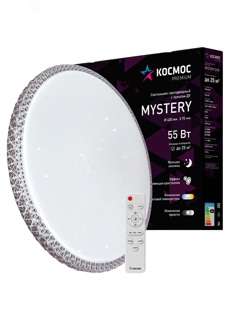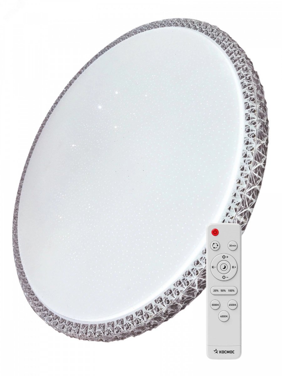 Светодиодный настенно-потолочный светильник Космос Premium Mystery - прекрасное решение для организации основного или дополнительного освещения офисных, торговых или жилых помещений. Неординарный, но сдержанный дизайн магии уюта. Регулировка цветовой температуры и мощности светового потока от 10 до 100% позволяет моделировать освещение по вашему вкусу. Имеется функция ночника. Доступны светильники с 3-я различными уровнями мощности для различных помещений, 55/75/120 Вт.
