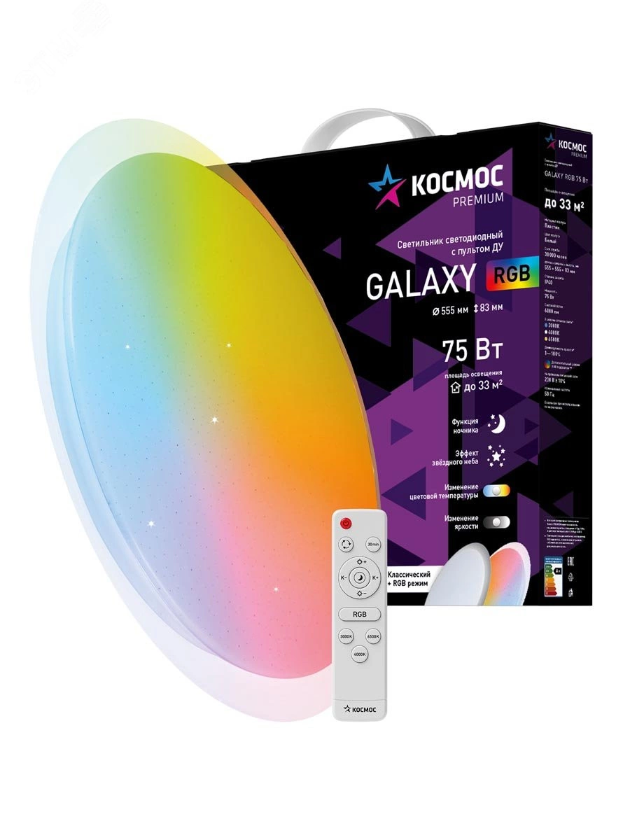 Светодиодный настенно-потолочный светильник Космос Premium Galaxy RGB - прекрасное решение для организации основного или дополнительного освещения офисных, торговых или жилых помещений. Футуристический дизайн. Регулировка цветовой температуры и мощности светового потока от 10 до 100% позволяет моделировать освещение по вашему вкусу. Имеется функция ночника. Основное отличие - это наличие RGB подсветки, позволяющей устраивать собственные световые шоу для релаксации и уюта.