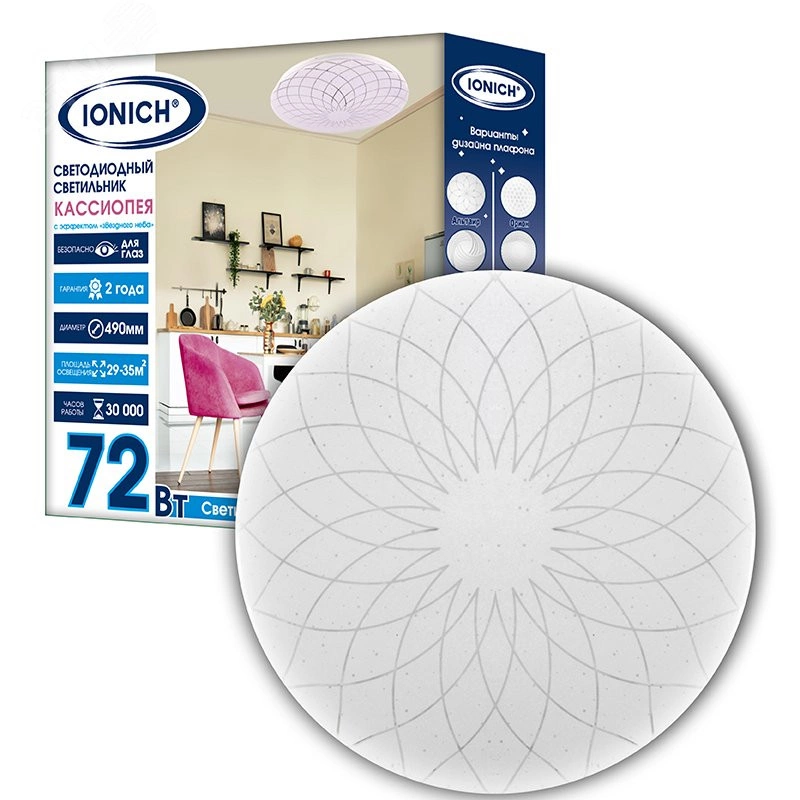 Современный дизайн светильника позволяет использовать его в качестве основного освещения различных зон и позволяет ему с лёгкость вписаться в любой интерьер, особенно актуальны жилые помещения (кухни, гостиные, спальни, детские комнаты). Светильник крепится непосредственно на опорную поверхность. Способ крепения - накладной, крепёж в комплект поставки не входит. Изготовлен из высококачественных, лёгких, прочных и экологически безопасных материалов. Поливинилхлорид, из которого сделан плафон, обладает высокой светопропускаемостью, а металлическое основание светильника покрыто белой порошковой краской, что надолго обеспечит отсутствие коррозии. Светильник имеет яркое равномерное свечение, драйвер входит в комплект поставки.