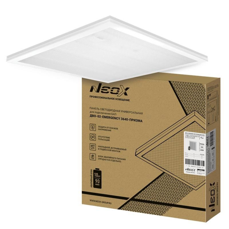 Полное описание: Светильник светодиодный ДВО-02-EMERGENCY 3640-ПРИЗМА 36Вт 4000К 595х595х19 без БАП-10W90 универс. панель NEOX 4690612053011