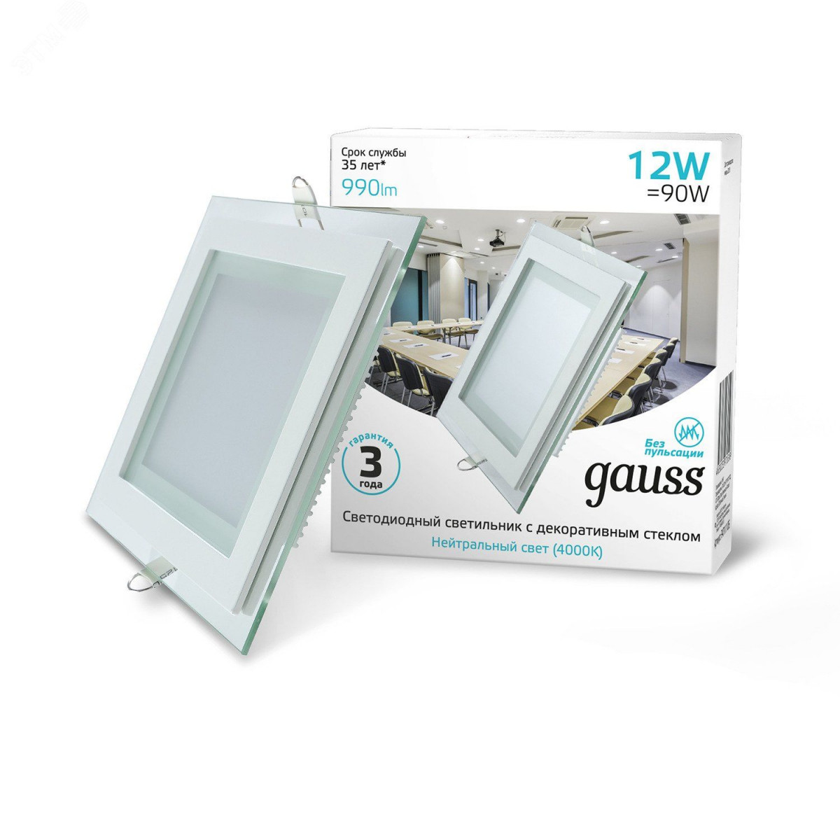 Светильник светодиодный ДВО 12 Вт 990 лм 4000К AC 220В IP20 квадрат 160х160х36мм монт разм 118х118мм Алюминий с декоративным стеклом Glass Gauss